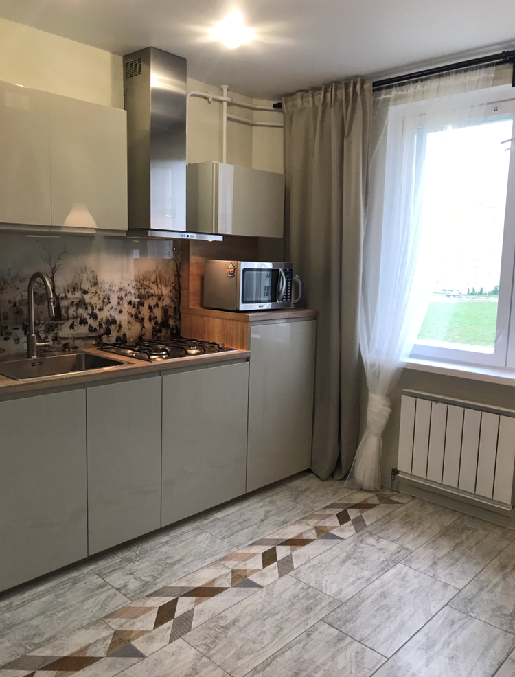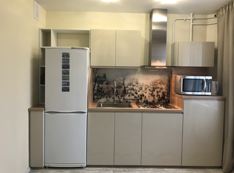 Линейный гарнитур в неоклассическом стиле из крашеной плиты МДФ.