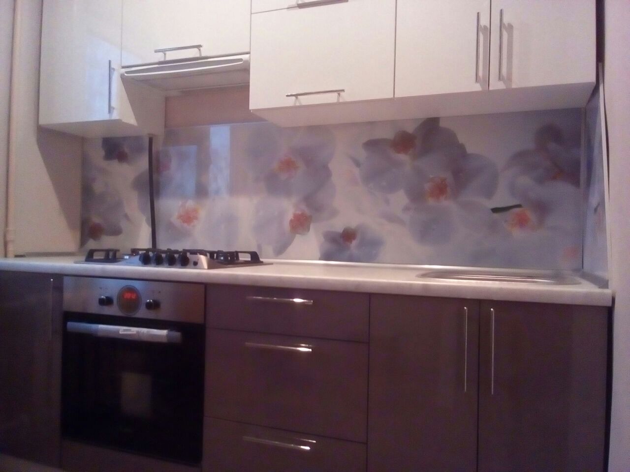 Отделка фасадов в двух цветах. Ширина кухни 220 см.