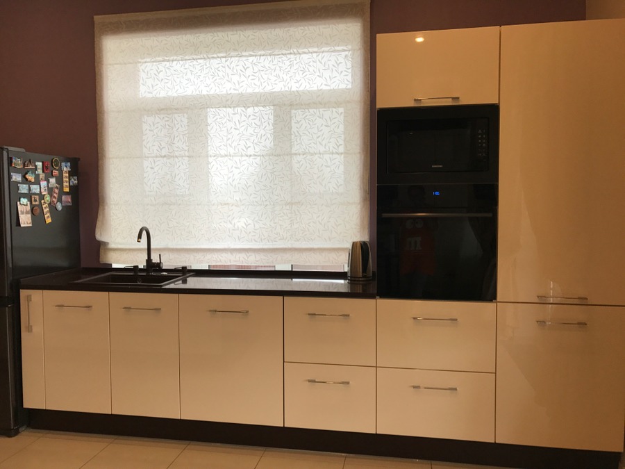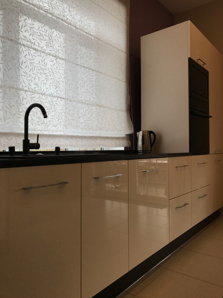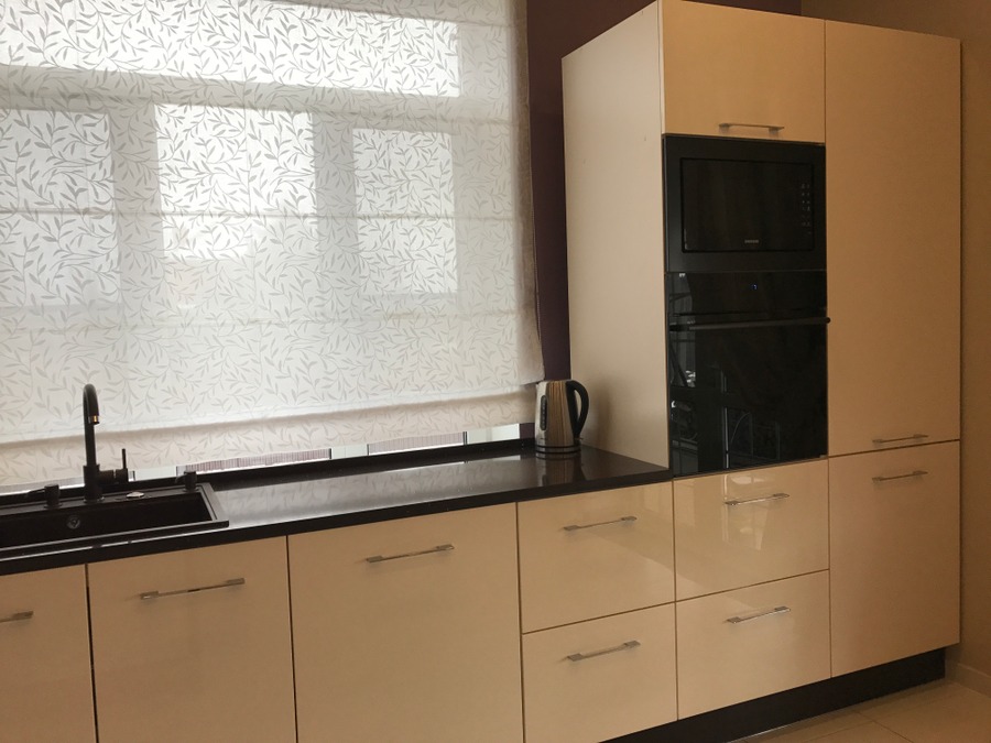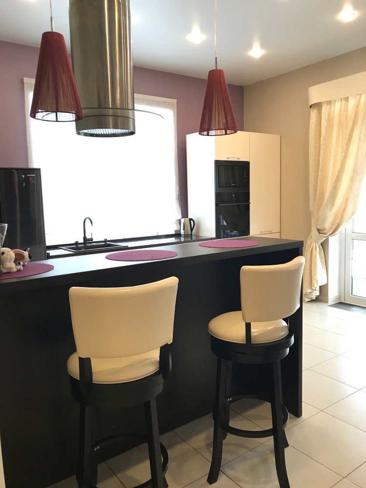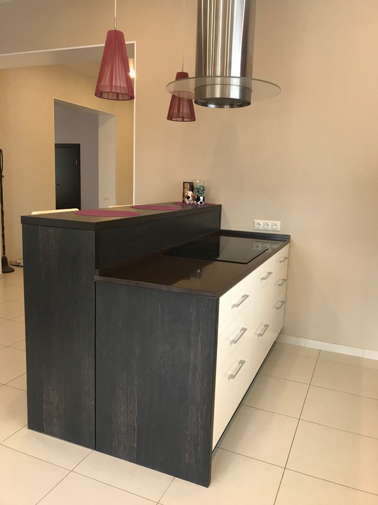 Современный и функциональный гарнитура с высокими шкафами и компактной барной стойкой.