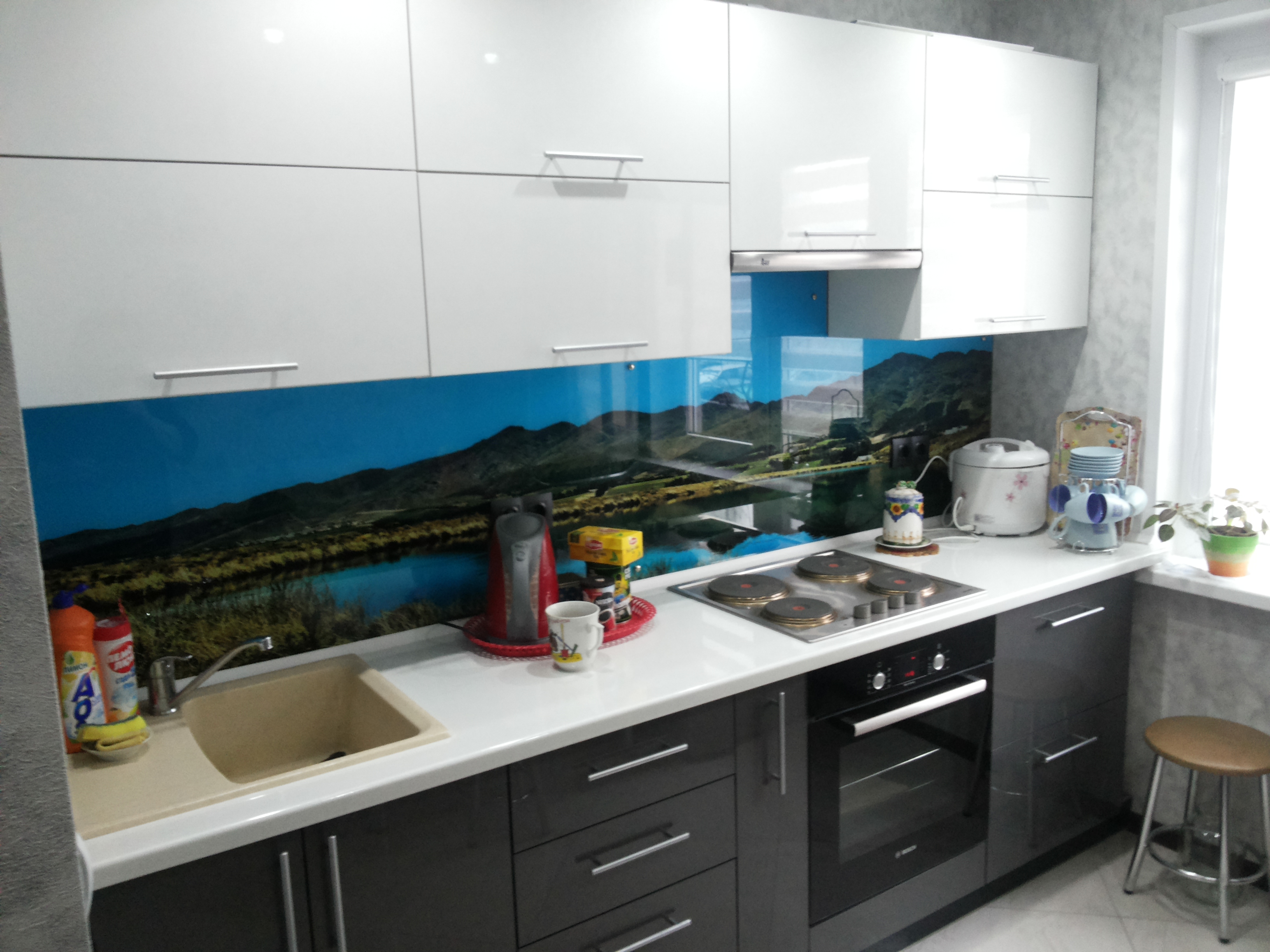 Скинали с фотопечатью, глянцевые фасады, хромированные ручки.