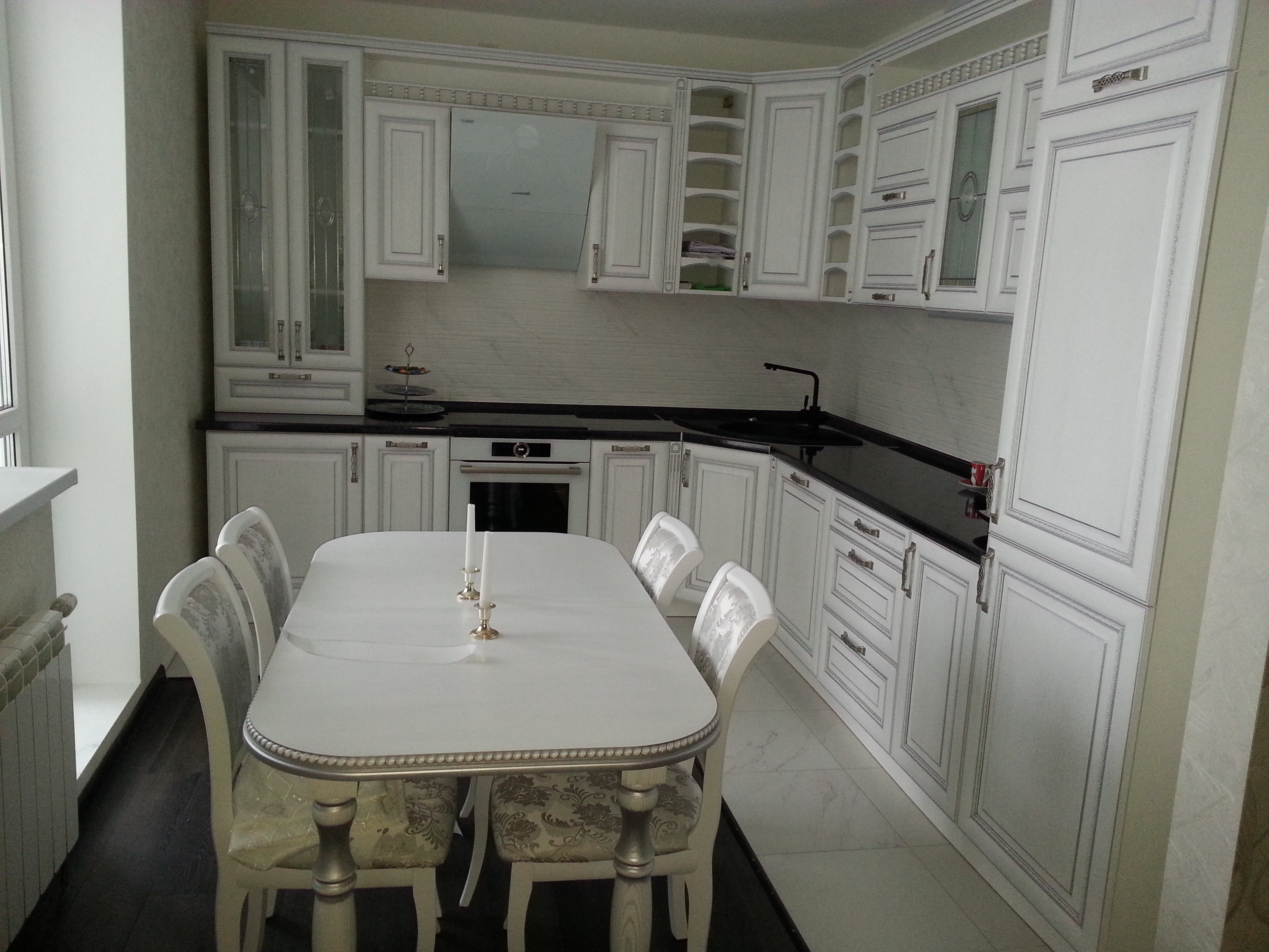 код 86695Белые фасады с патиной и филенками из массива дерева. Глянцевая черная столешница.
