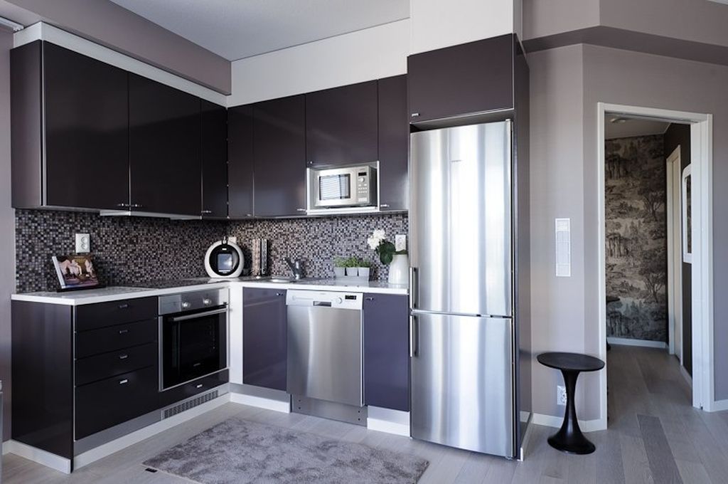 Контрастное сочетание цветов, множество шкафчиков для хранения, ниши для техники, удобная фурнитура.