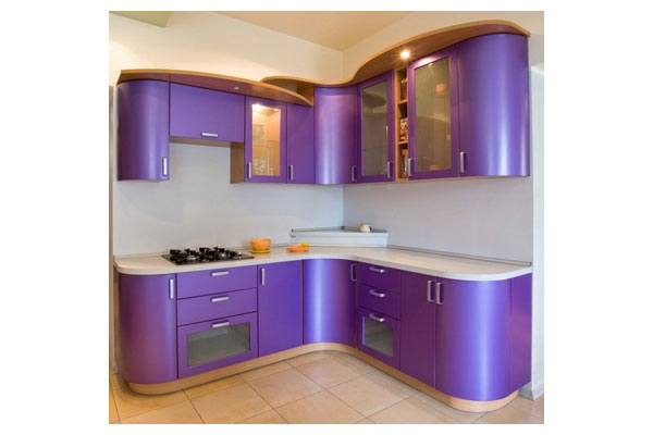 Стильная угловая кухня оборудована радиусными фасадами и представлена в современном фиолетовом цвете. Ударопрочная столешница оснащена специальным местом для установки варочной панели. Элементы стекла на некоторых створках шкафов придают гарнитуру интересный внешний вид. В комплекте имеется также яркая подсветка рабочей зоны.