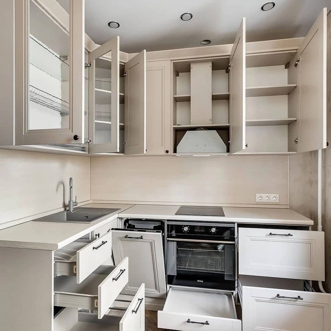 Угловая планировка позволяет максимально эффективно использовать пространство и разместить все необходимые кухонные принадлежности и продукты. Это особенно удобно для небольших помещений, где каждый квадратный метр на счету.