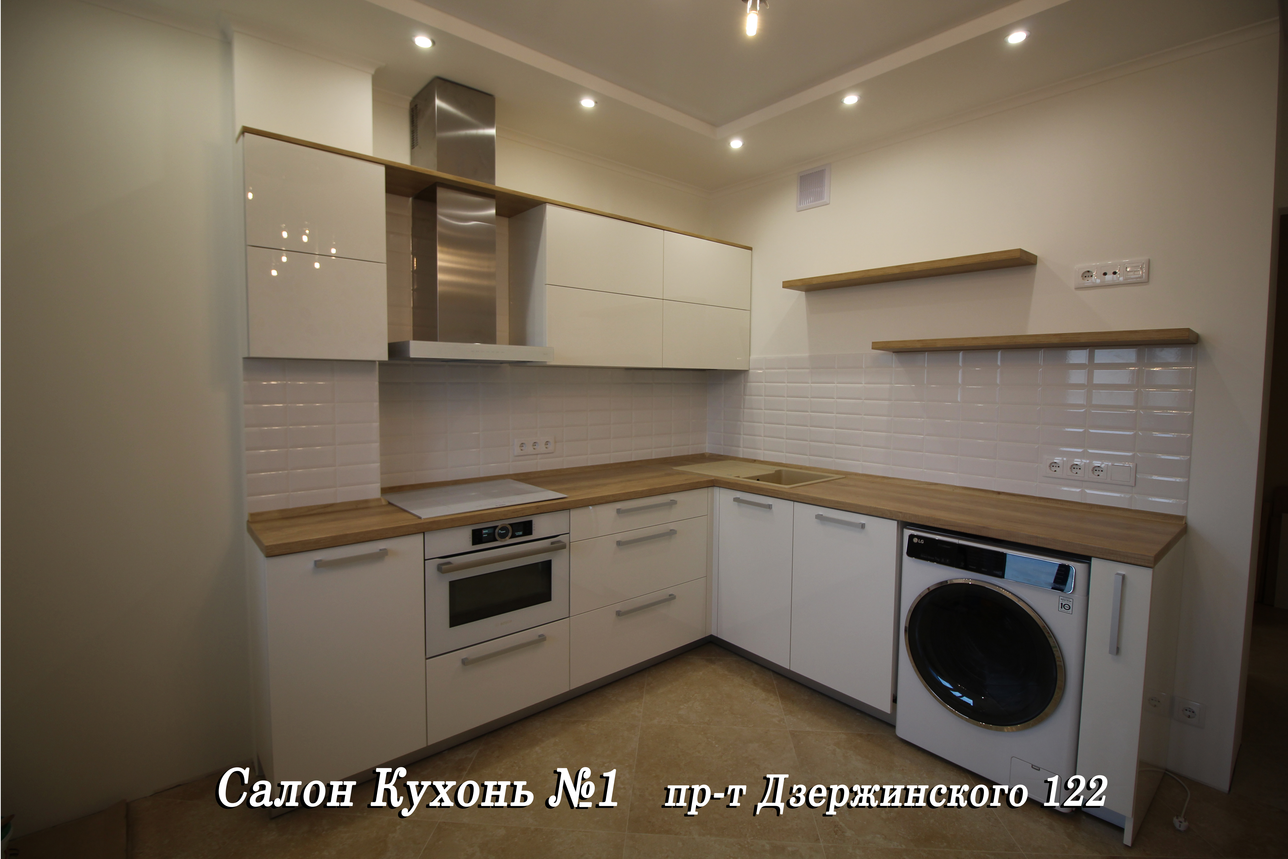 Компактная и эффектная угловая кухня в стиле «кантри». Оснащена нишей под Т-образную вытяжку, открытыми полками и длинной столешницей, а также встроенным пространством под плиту, мойку и стиральную машину. Комбинированные открытые и закрытые ящики для хранения с хромированной фурнитурой.