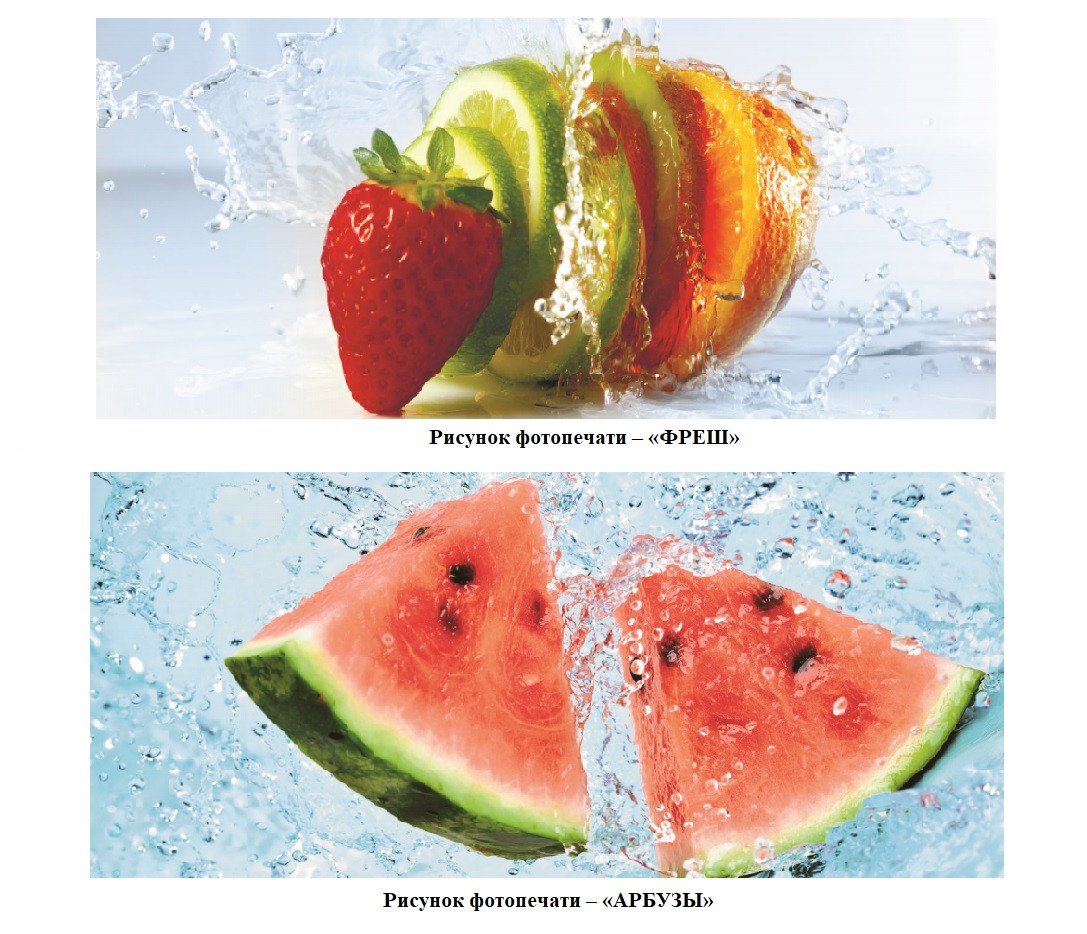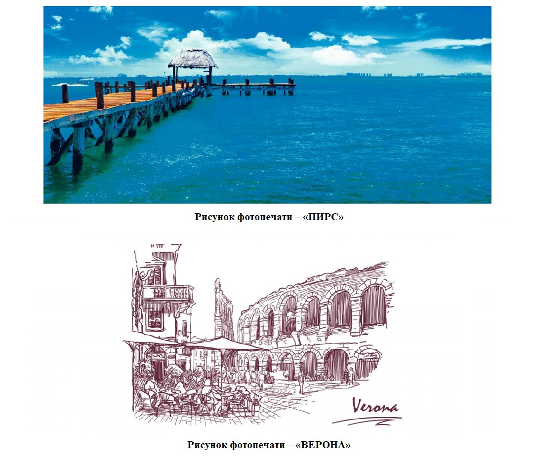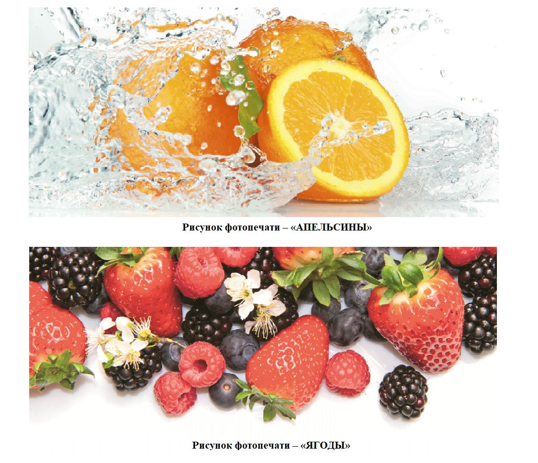 На верхних фасадах из ЛДСП выполнена УФ-фотопечать. Максимальный размер рисунка (В) 703мм х (Д) 1600 мм (эквивалент 4-м створкам Ш-400). При изготовлении комплекта фасада с фотопечатью длиной менее 1600мм картинка обрезается. Фасады верхних модулей включают в себя створки, изготовленные из ЛДСП 16 мм с нанесенным рисунком и одного рамочного фасада. При использовании фотопечати со 100% заполнением площади верхних фасадов ЛДСП применяется только ЛДСП 16мм Белый (шагрень). Торцы фасадов ЛДСП имеют оседание красочного тумана.