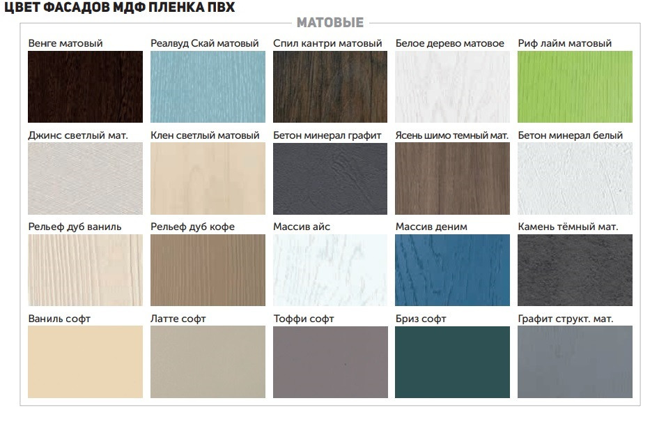 - ПРИНТ – фасады выполненные из МДФ 16мм облицованные пленкой ПВХ. По периметру фасады МДФ имеют калевку R5мм, ручки располагаются горизонтально.