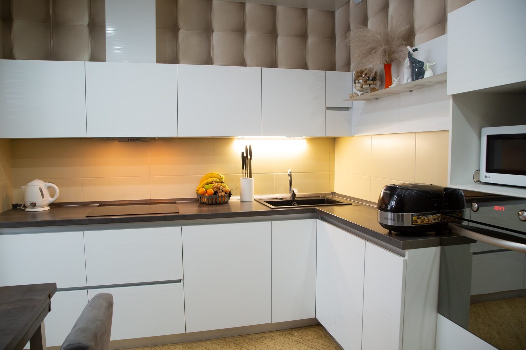 - Функциональность: комплект включает в себя все необходимые элементы для комфортной готовки и приёма пищи: шкафы, полки, столешницы, ящики и т. д.