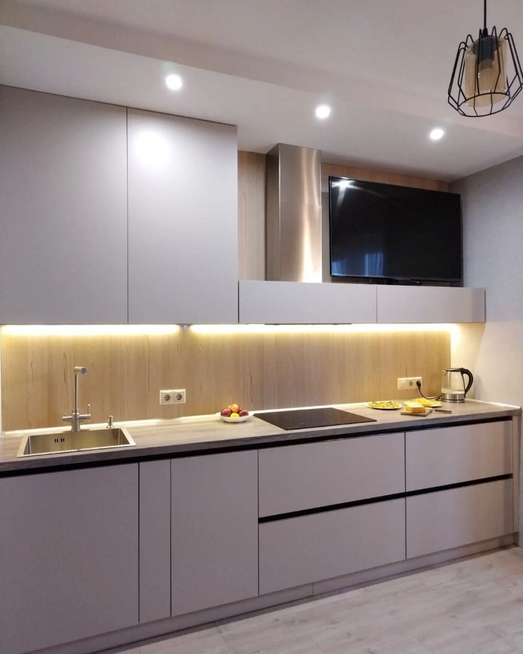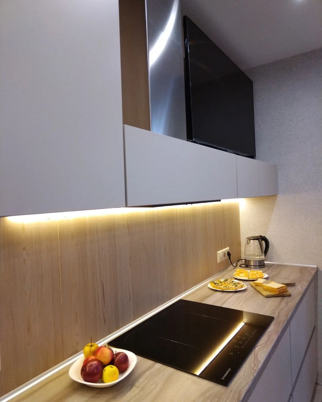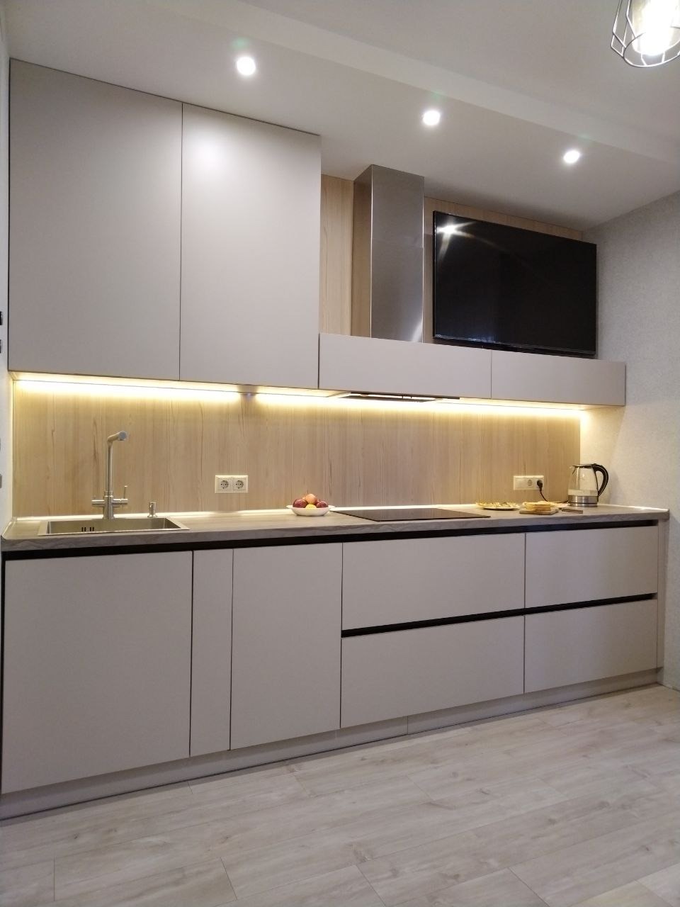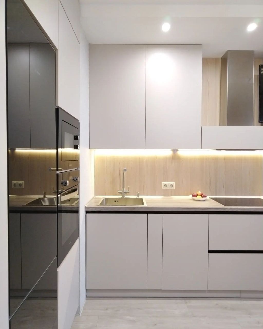 Светлые глянцевые фасады. современная и надежная фурнитура, ниши для техники.