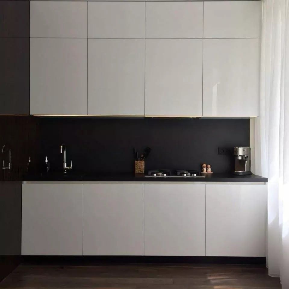 Белые фасады с фрезеровкой. Ширина кухни 220 см.