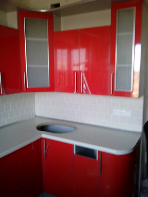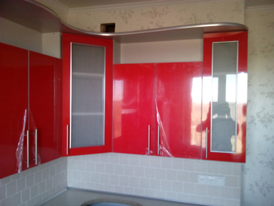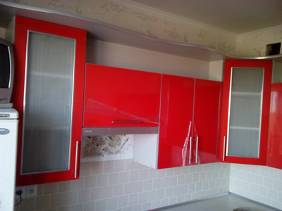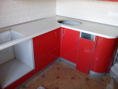 Красная кухня с радиусным корпусом представляет собой стандартную угловую конструкцию. Данная модель оборудована множеством просторных выдвижных ящиков и шкафов с глянцевой структурой поверхности.