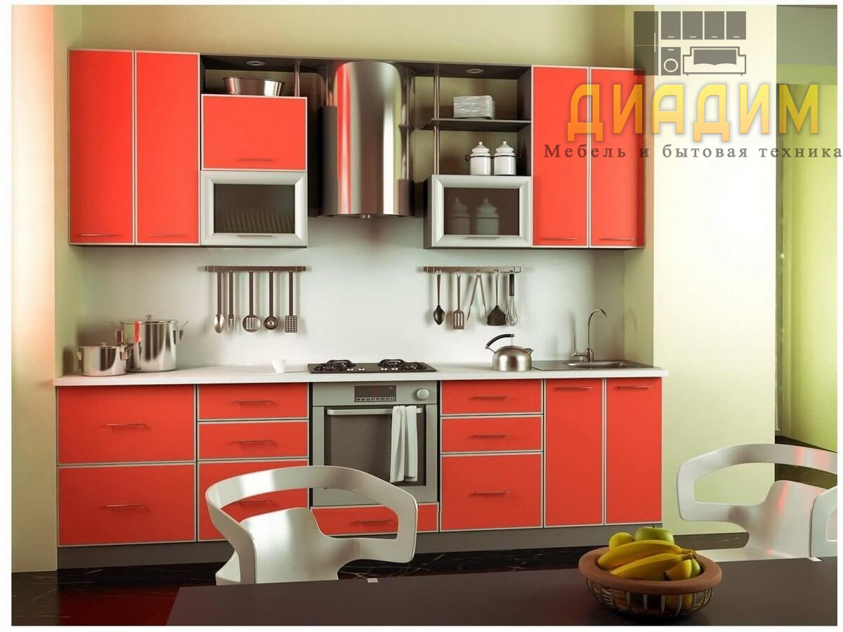 Фасады красного цвета декорированы металлическими серыми линиями. Кухня весьма компактна, но функциональна. Она по форме прямая. Столешница выделяется за счет белого окраса. Поверхность фасадов матовая, поэтому общий вид смотрится не сильно пестро. Шкафы и ящики разных размеров позволят расфасовать утварь в соответствии с их габаритами.