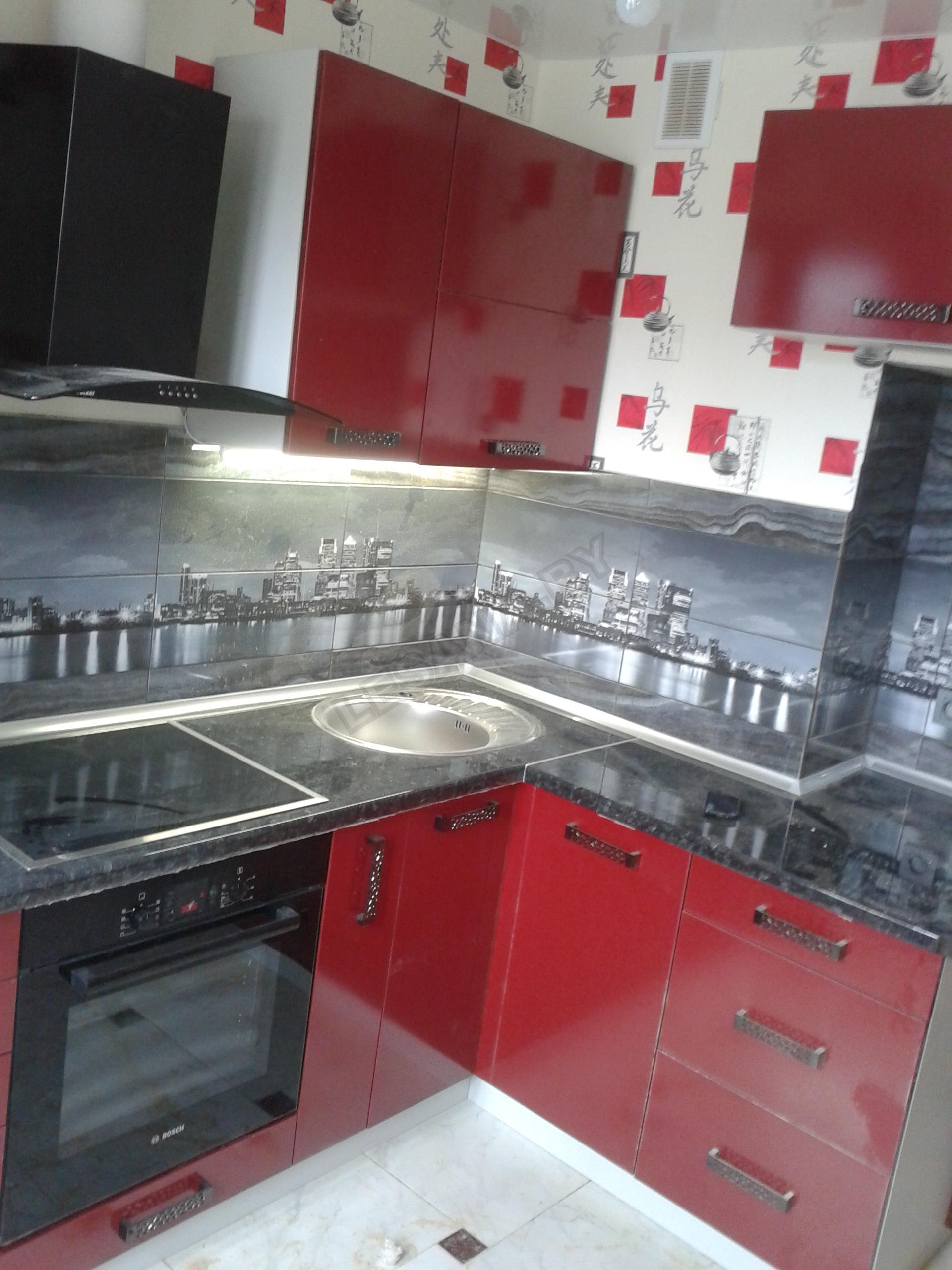 Красная угловая кухня со столешницей под камень