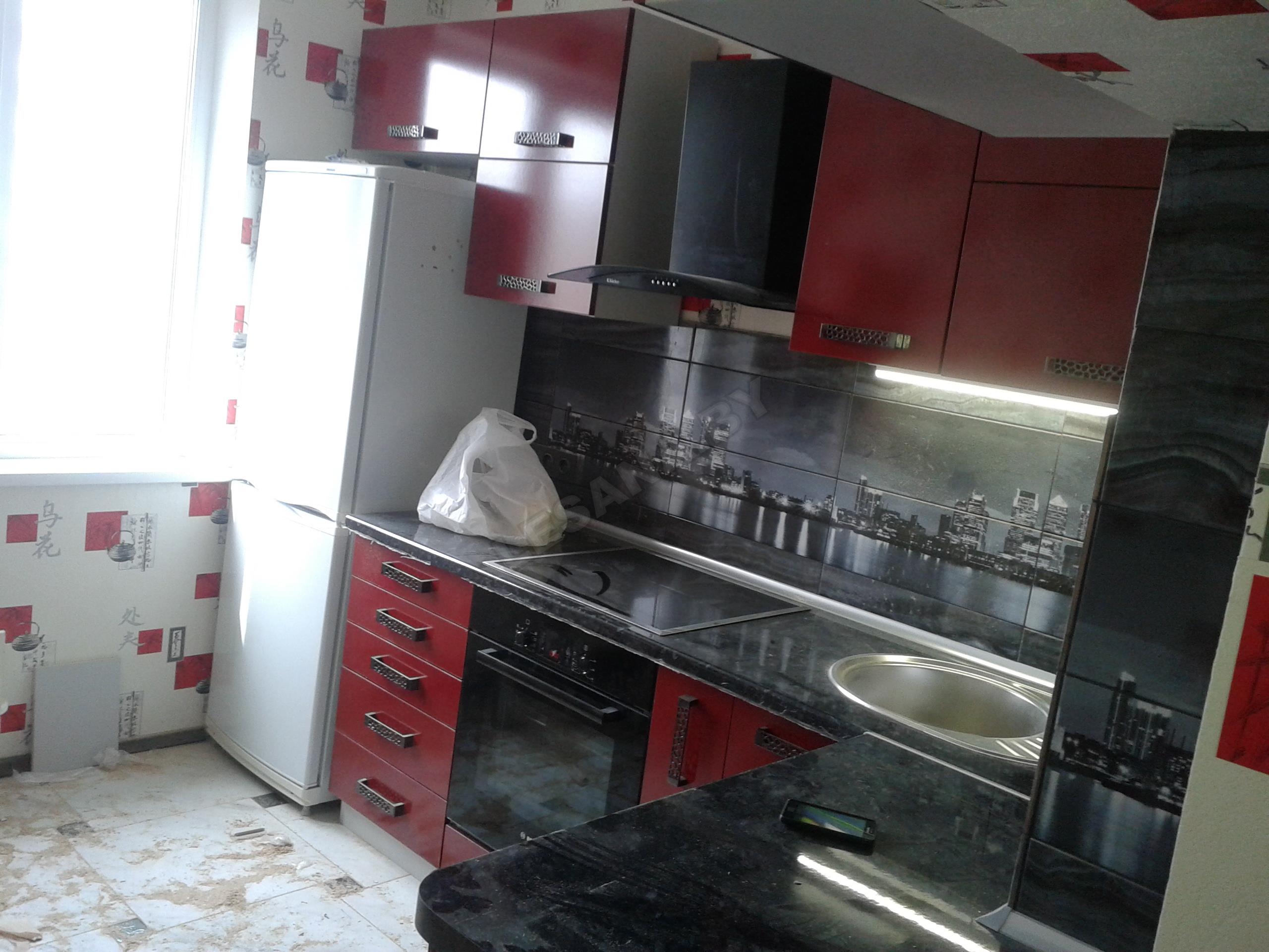 код 88540Темно-красный глянцевый фасад. Столешница под черный камень. Встроенная подсветка.
