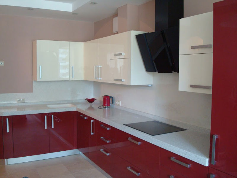 Красно-белая угловая изысканная кухня выполнена в соответствии с современным дизайном. Кухня отличается надежной и функциональной ультросовременной фурнитурой и белой столешницей из искусственного камня. Прочность и долговечность станут синонимами успешного использования столешницы для приготовления пищи.