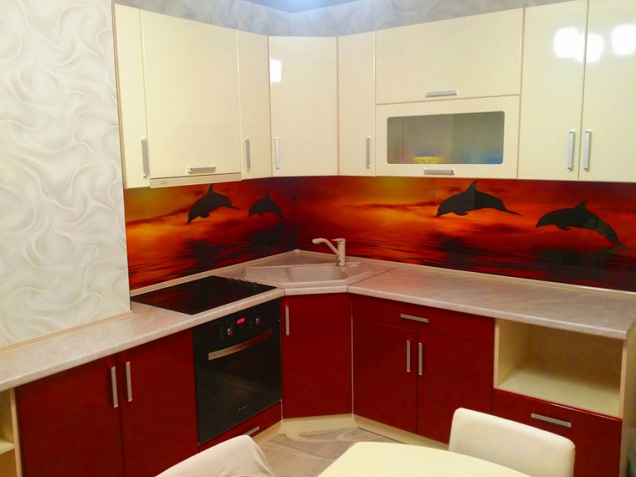 Живописная угловая кухня с комбинированными красными и белыми фасадами обладает необходимыми при готовке удобствами, такими как вырез под варочную панель в столешнице. Столешница под белый камень органично сочетается с цветами фасадов. Обращают на себя внимание неординарный дизайн ручек.