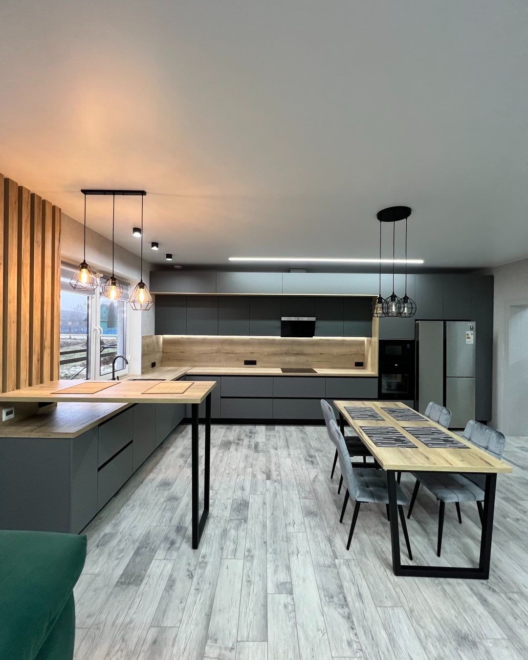 Однотонный древесный цвет фасадов из ЛДСП. Ширина кухни 170 см.