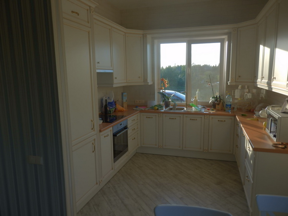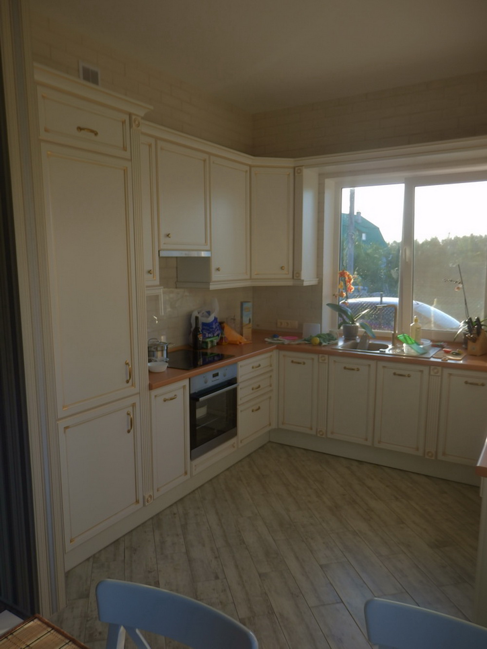 Угловой кухонный гарнитур расположенный по периметру помещение. Многочисленные секции выполнены в классическом стиле с золотистым обрамлением, как и фурнитура. Столешница выполнена в естественном цвете. Имеется пространство для вытяжки духового шкафа.