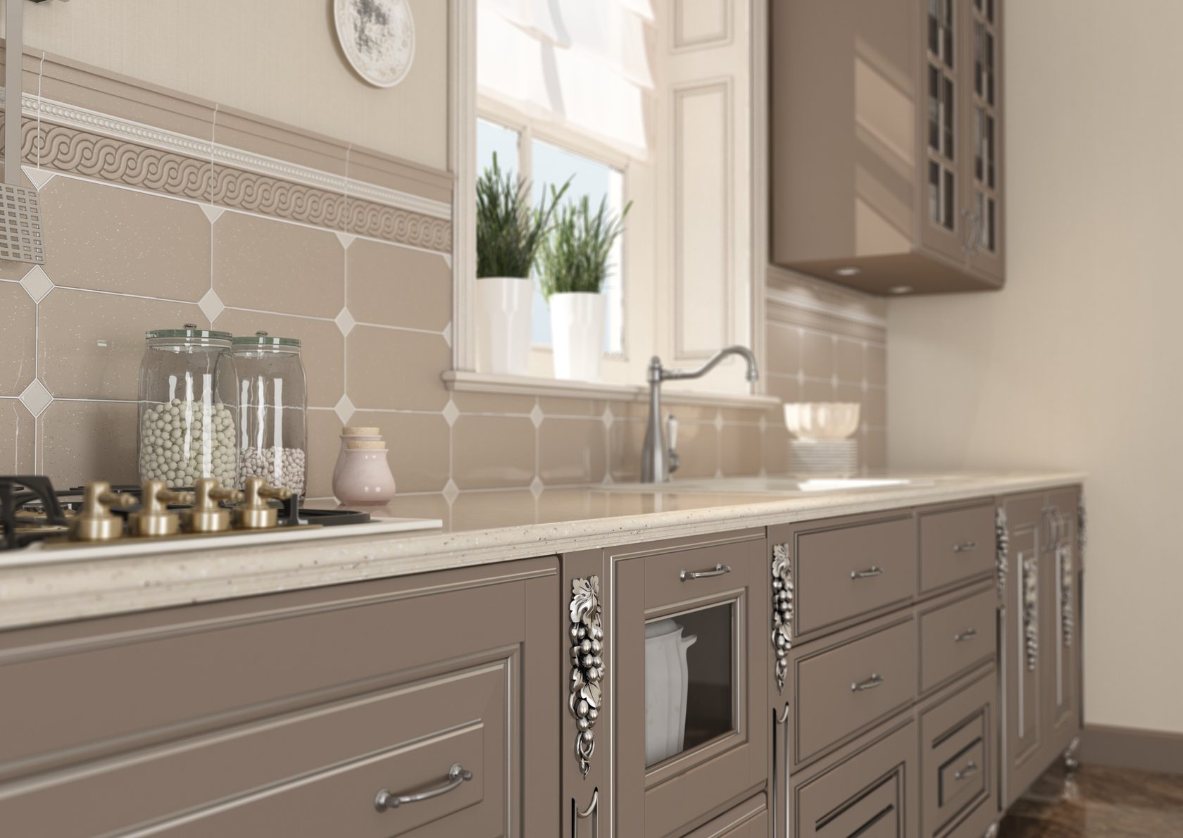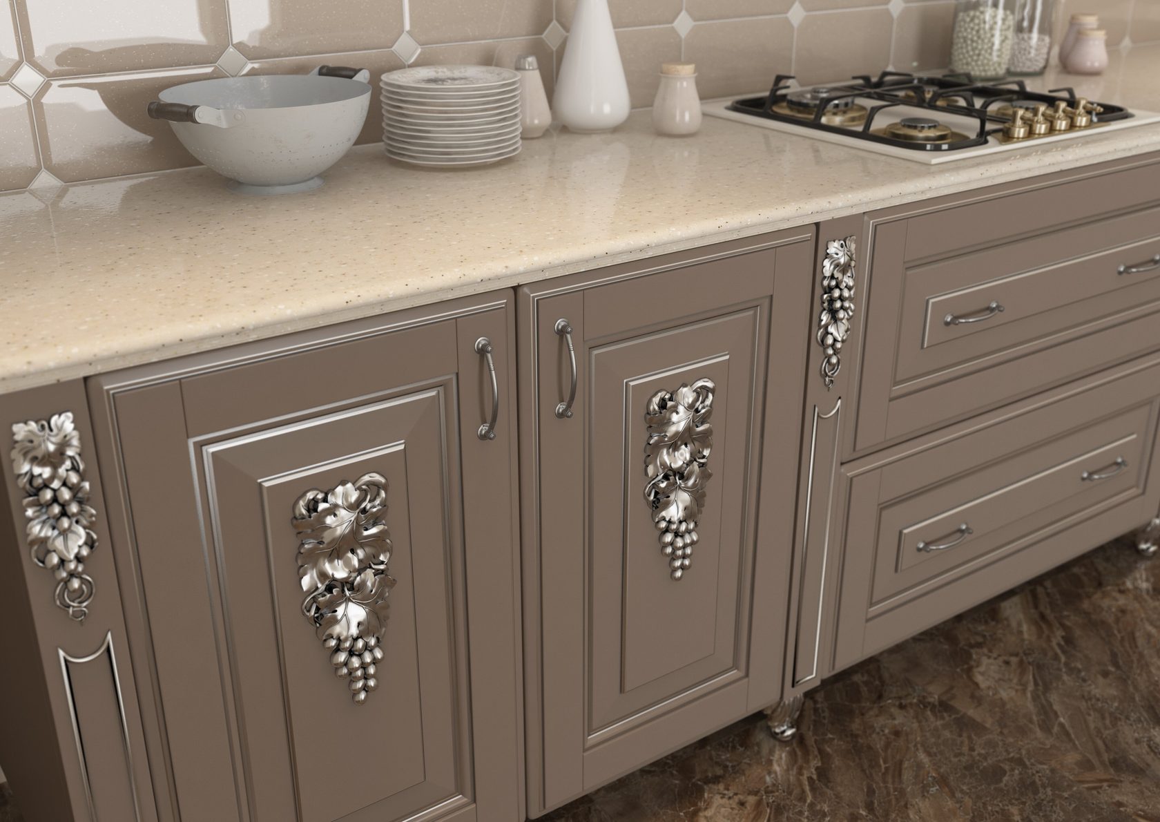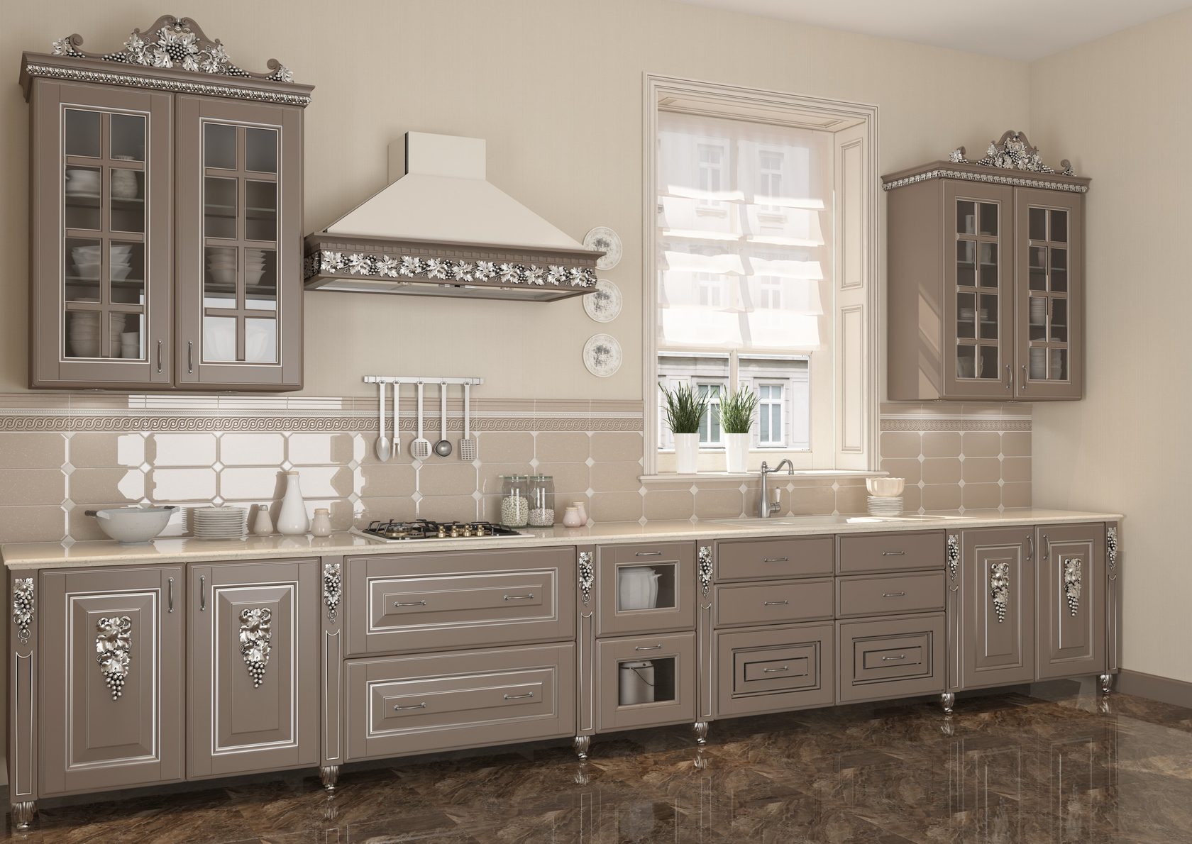 Кухня выполнена в светло-коричневом цвете. Столешницы - белого цвета. Фасады украшены изящным серебрянным рисунком. Большое количество функциональных полок и ящиков. В комплекте присутствует вытяжка и два подвесных удобных шкафчика для хранения посуды.