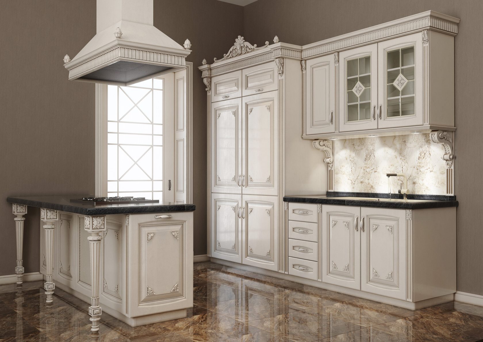 Кухня выполнена в классическом дизайне в стиле античности. Шкафы и вытяжка в светлом цвете, столешницы черного цвета. Отличительная особенность модели - барельефные узоры на фасадах и ножки для столешницы изящной формы.