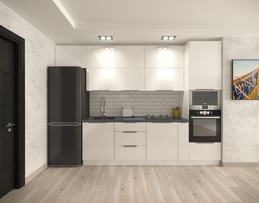 Матовые фасады с ручками из металла. Ширина кухни 190 см.