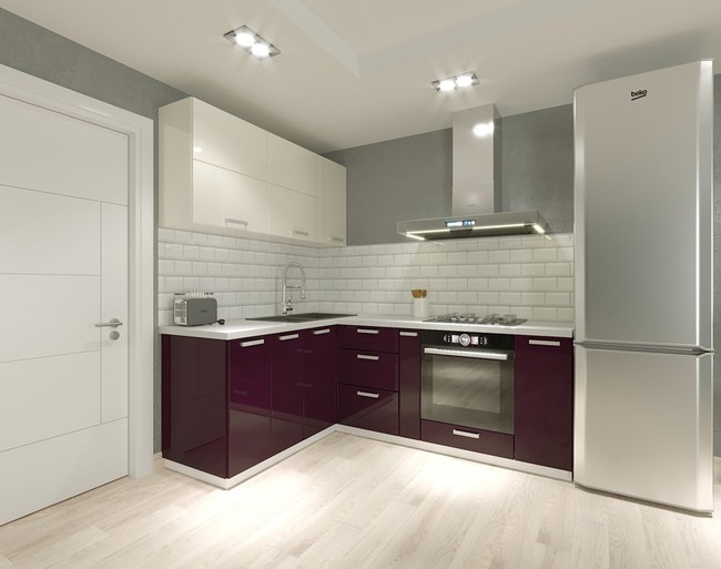 Отделка фасадов в двух цветах. Ширина кухни 170 см.
