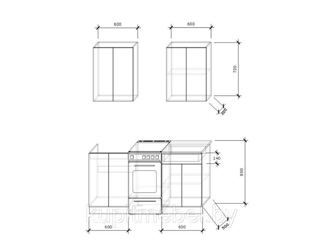 - Глубина нижних шкафов - 60 см (50 см по корпусу).