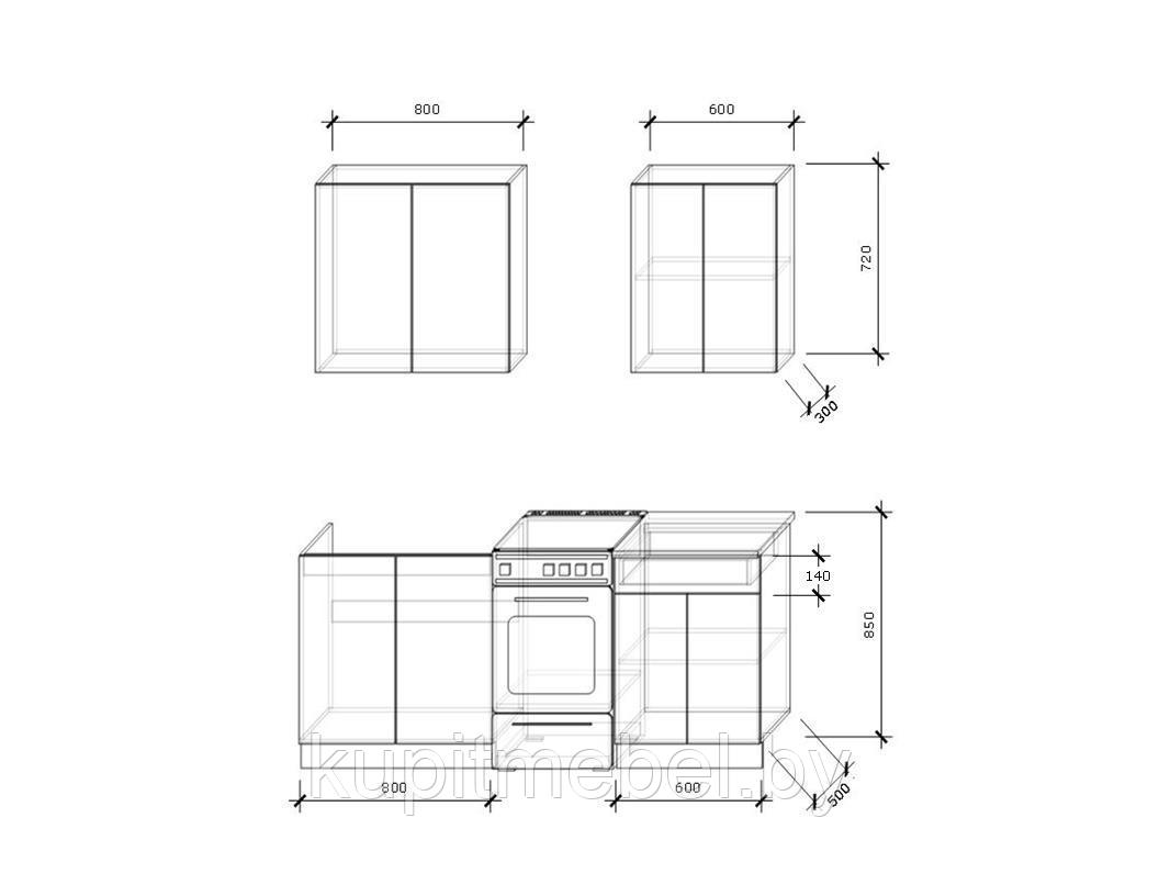 - Глубина нижних шкафов - 60 см (50 см по корпусу).