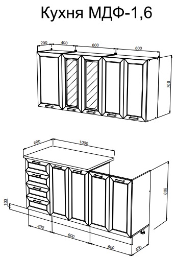 - Два стола - общая ширина 1000 (400мм с выдвижным ящиком, 600мм с распашными фасадами) и стол под мойку на 600мм. Высота 840мм. Глубина 402мм.