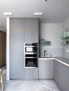 Современная угловая кухня в серых тонах. Верхние фасады без ручек.
