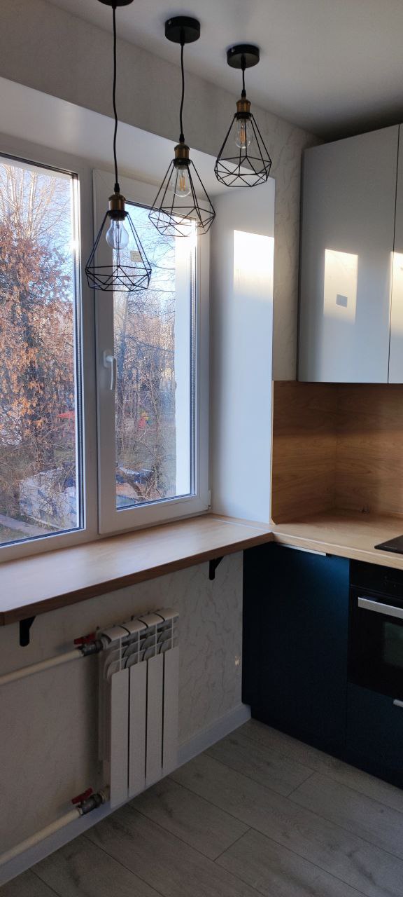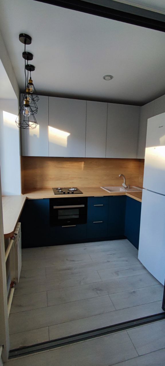 Угловая кухня с открытыми и закрытыми полками. Матовые фасады.