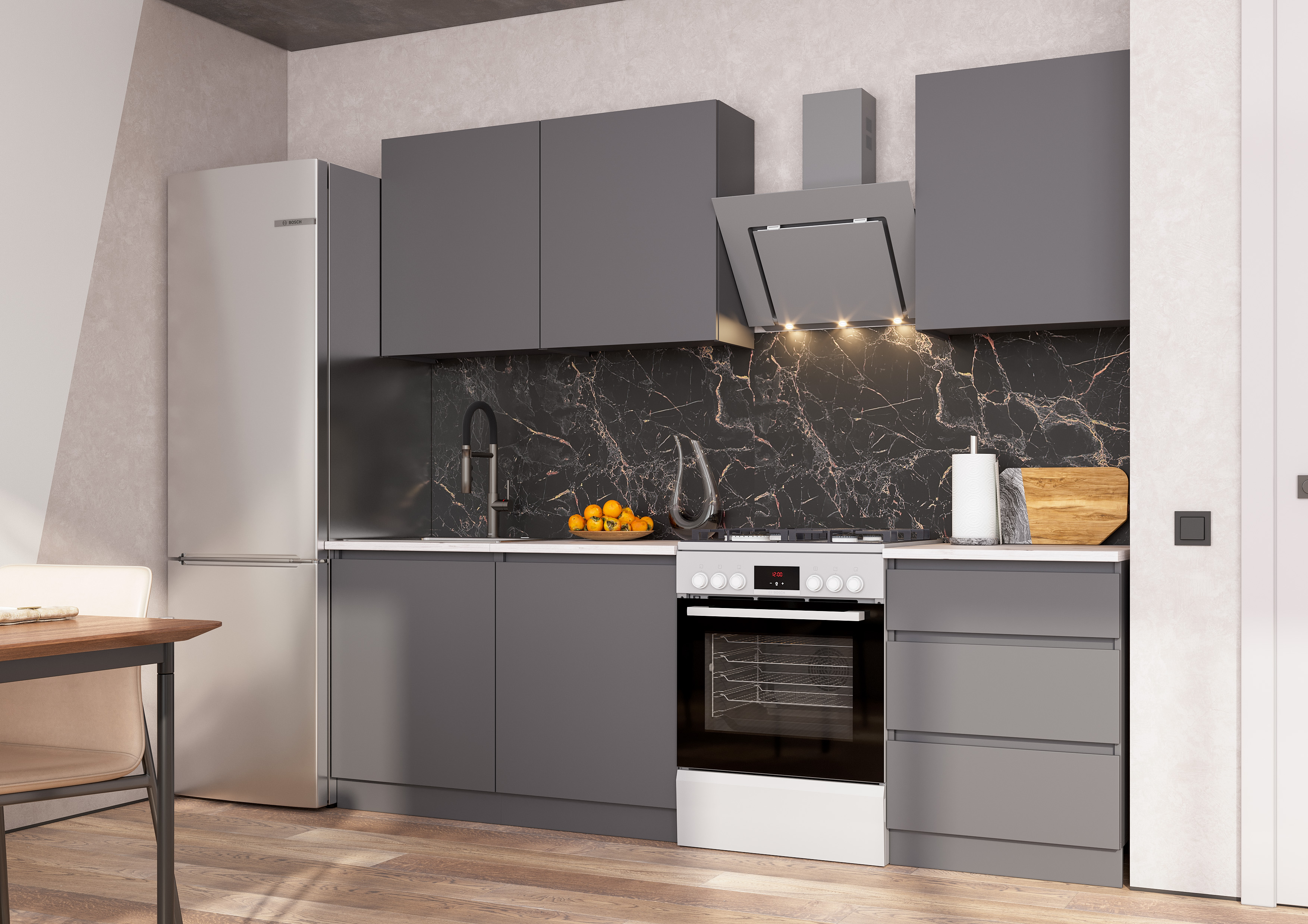 Удобные металлические ручки в цвете «сатин». Ширина кухни 140 см.