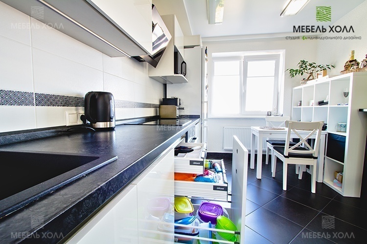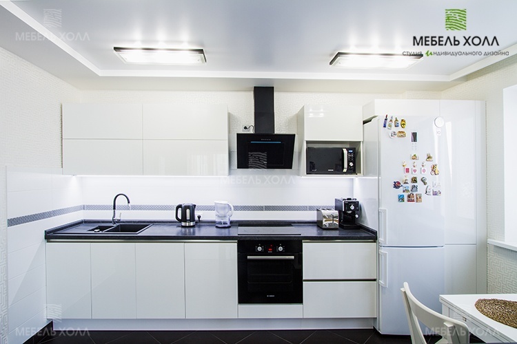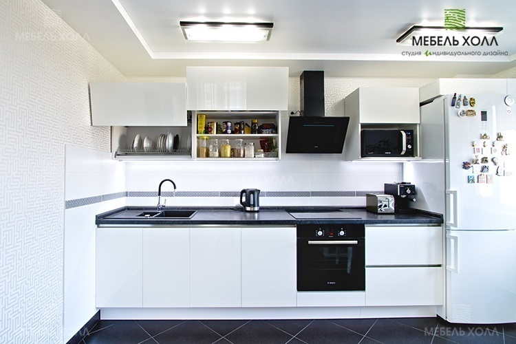 Прямая светлая кухня с акриловыми фасадами Alvic Luxe Blanco и встроенной подсветкой. Ящики оборудованы подъемными и выдвижными механизмами Blum. Столешница выполнена из постформинга Rezopal, сушка - Rejs.