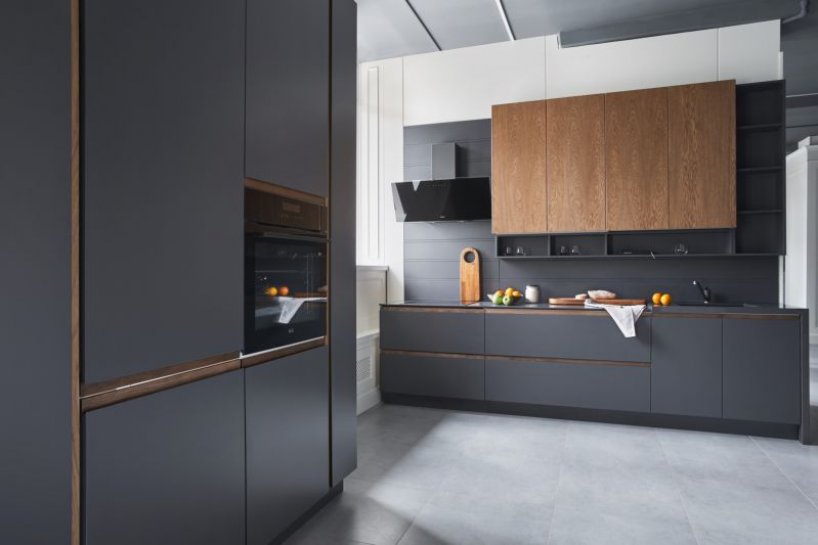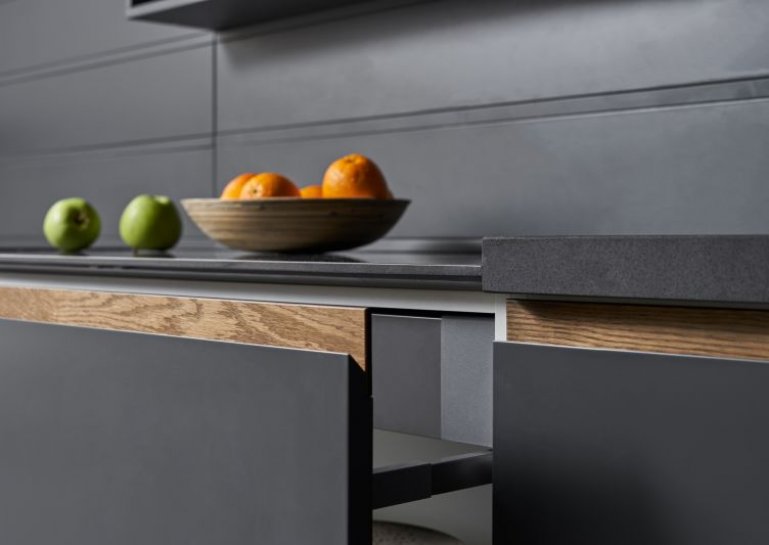 Фасады особой конструкции с интегрированными ручками, позволяющие полностью отказаться от использования внешней фурнитуры, не только придают интерьеру современную лаконичность, но и делают более удобной работу на кухне.
