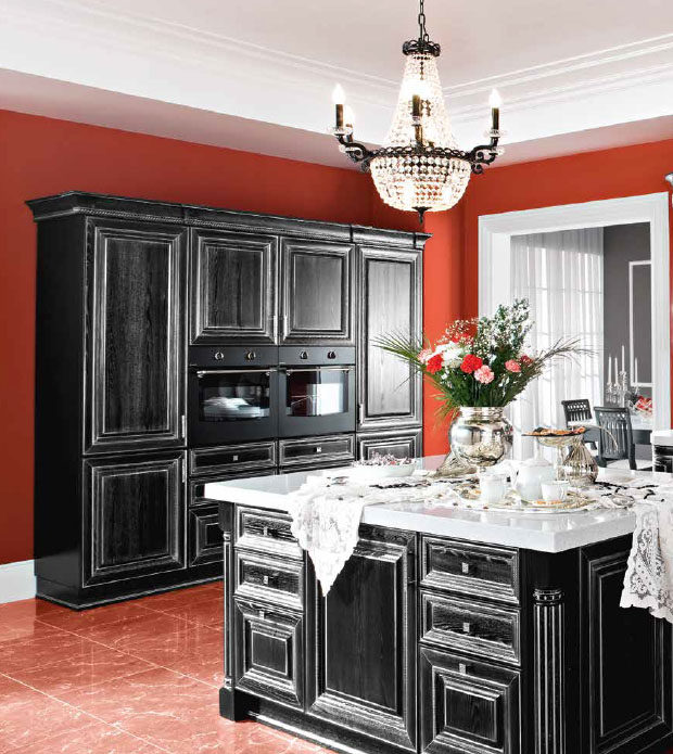 Для создания очень элегантного и неповторимого интерьера в итальянском стиле прекрасно подойдет кухня Al'Tako, выполненная в элегантном черном цвете с белой патиной. Створки декорированы при помощи глубокой фигурной фрезеровки и резных колонн. Темная цветовая гамма очень выйгрышно разбавлена массивной белой столешницей. Модель изготовлена из массива,что делает ее очень прочной и долговечной.