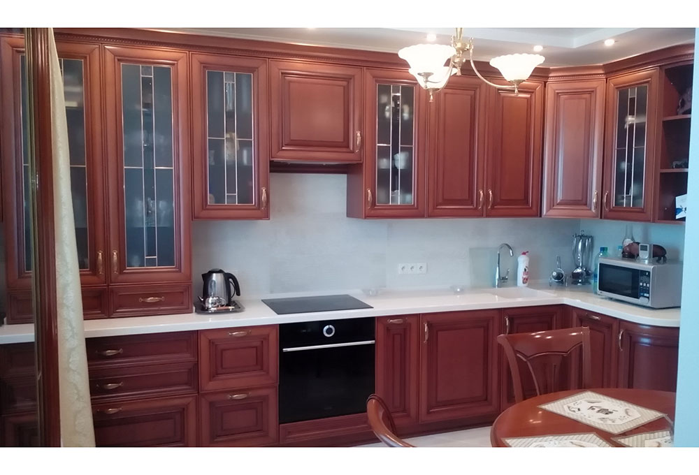 Грациозный классический стиль угловой кухне предают фугурные филенчатые вставки и стеклянные витражи в верхнем модуле. Фасад выполнен в очень приятном цвете груша, который делает интерьер очень домашним, теплым и уютным. А белая столешница постформинг добавляет немного легкости и воздушности.