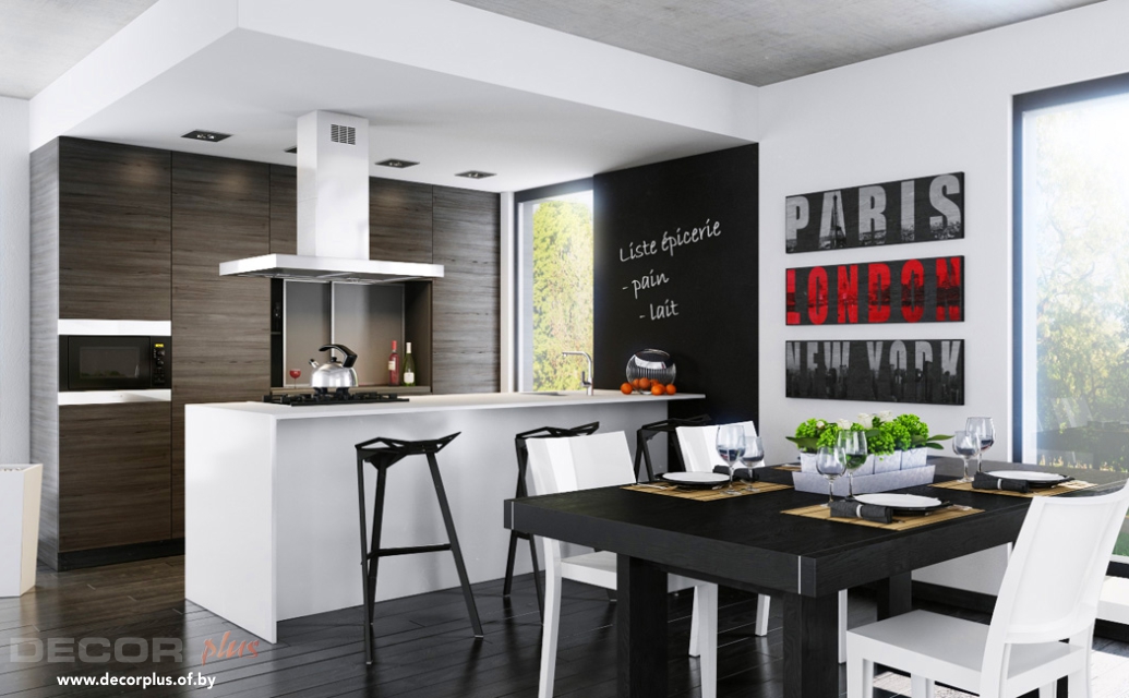 Современный прямой кухонный гарнитур с островом-стойкой для лофта, студио или просторной кухни со столовой зоной. Пристенный блок имеет небольшую нишу с раздвижными дверцами и ламинирован под дерево нейтрального оттенка, сконструирован специально для встроенной техники: духового шкафа, холодильника, морозильной камеры, посудомоечной машины. Рабочая зона изготовлена в виде острова и дополнительно включает в себя барную стойку, окрашена в белый матовый цвет.