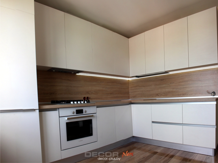 Современная угловая кухня с белыми глянцевыми фасадами без ручек