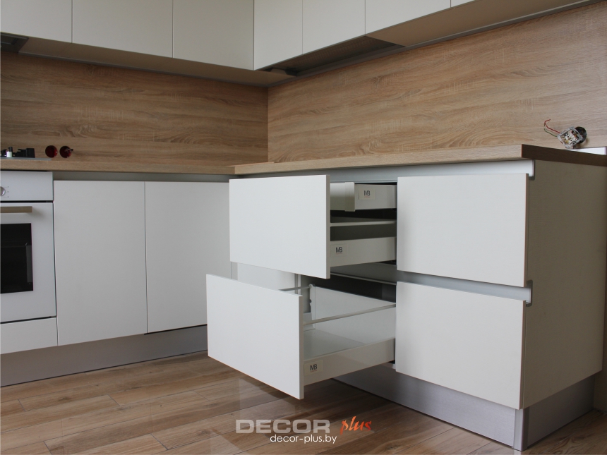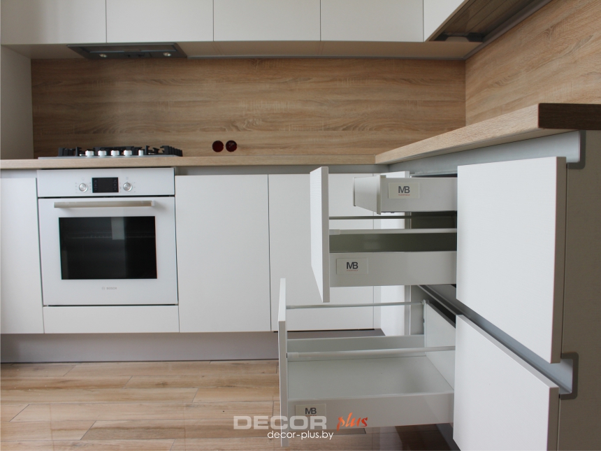 Качественная фурнитура польского и австрийского производства от Blum и GTV. Направляющие и петли с доводчиком, полное выдвижение ящиков. В корпус встроена подстветка.