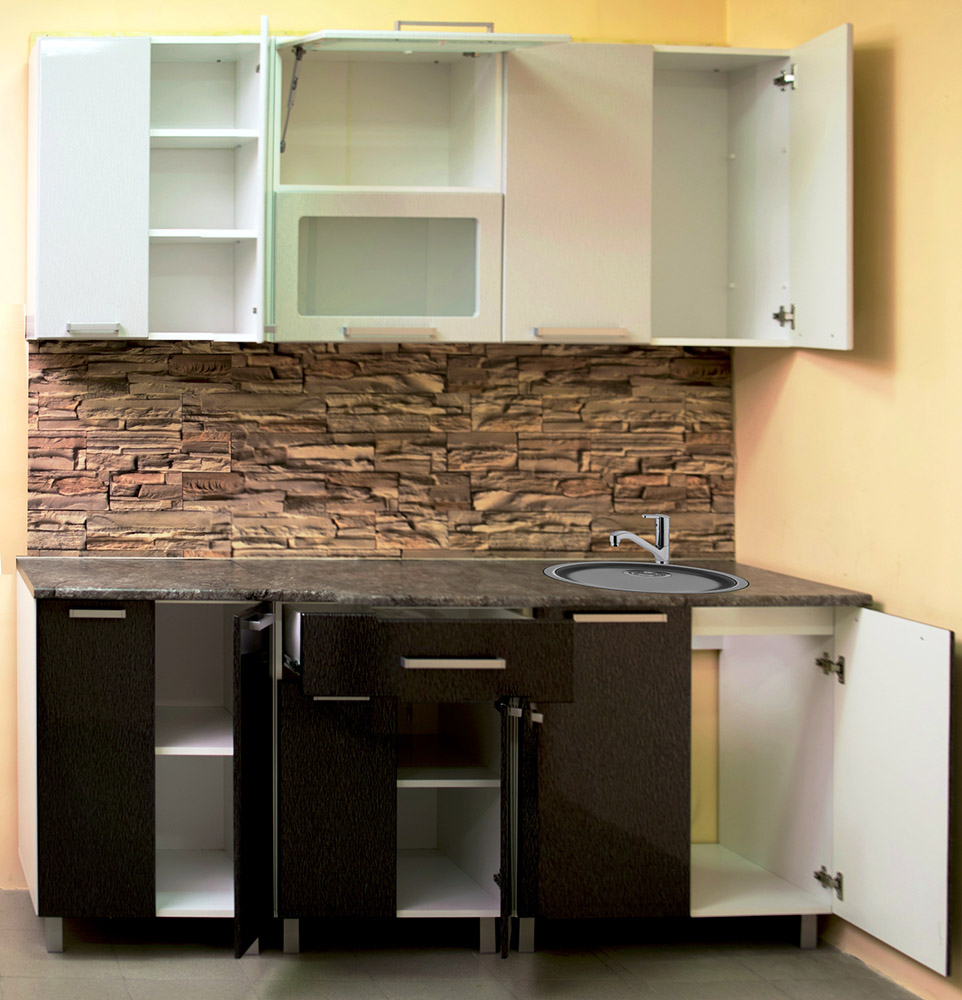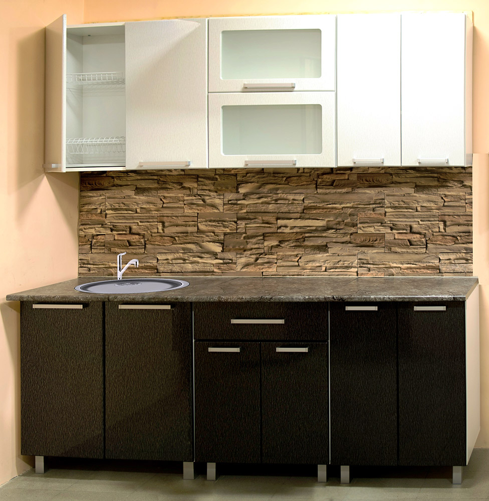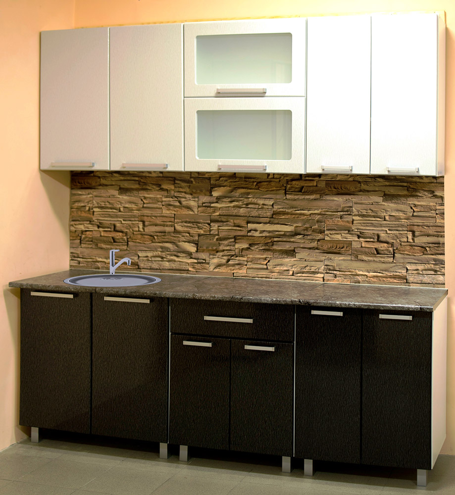 Компактная кухня «Андрия» сочетает в себе высокий уровень функциональности и небольшие габариты Низ кухни выполнен в черном цвете, а верхняя часть в белом. Фасады гарнитура имитируют деревянную фактуру.