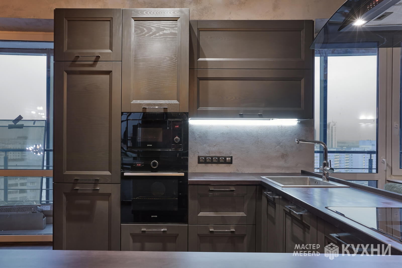 Современный дизайн, врезная подсветка рабочей зоны, фасады без ручек.