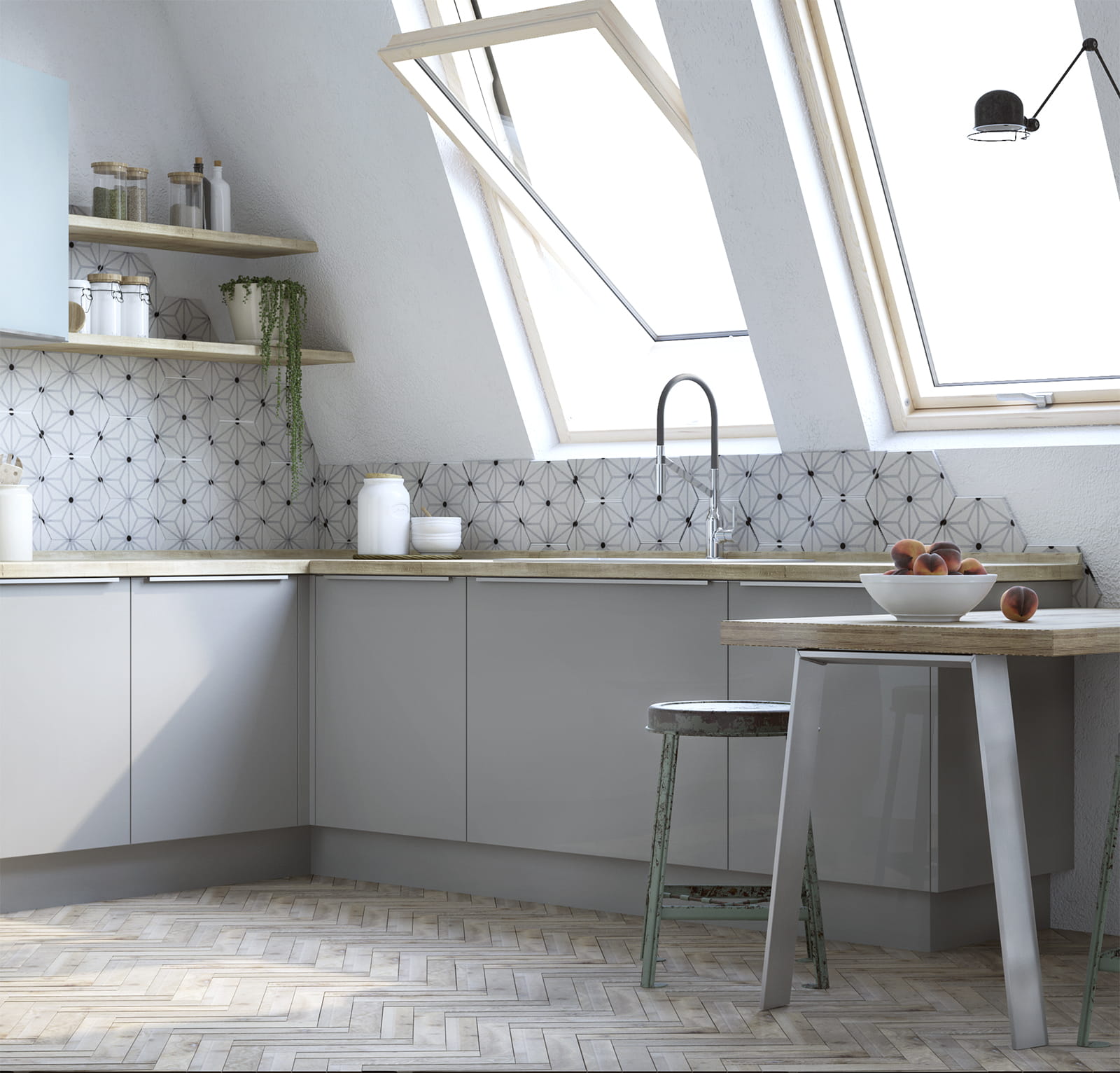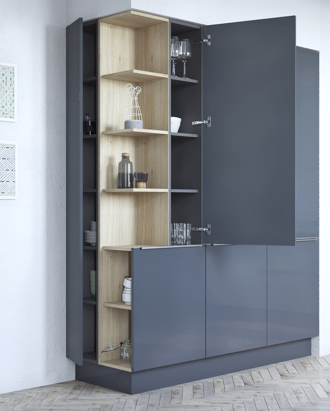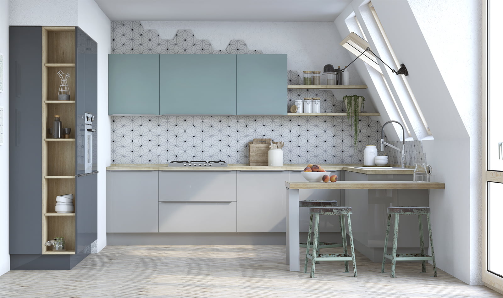 Фасады крашеная мдф, цвет ral 7031 blue grey глянец / zov 240 глянец / zov 246 матовый (структурный) столешница пластик hpl, 38 мм, цвет туя