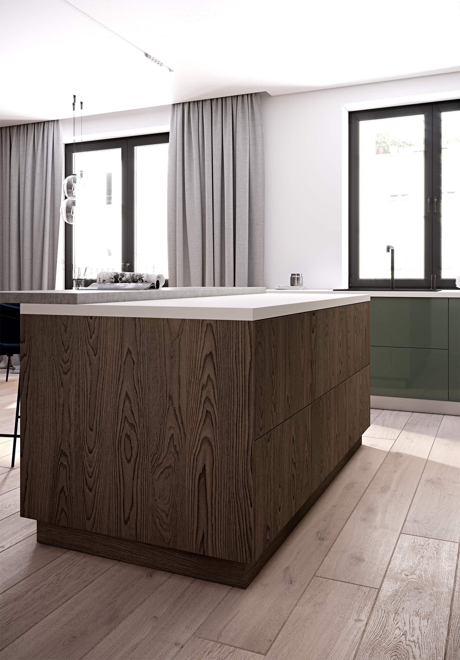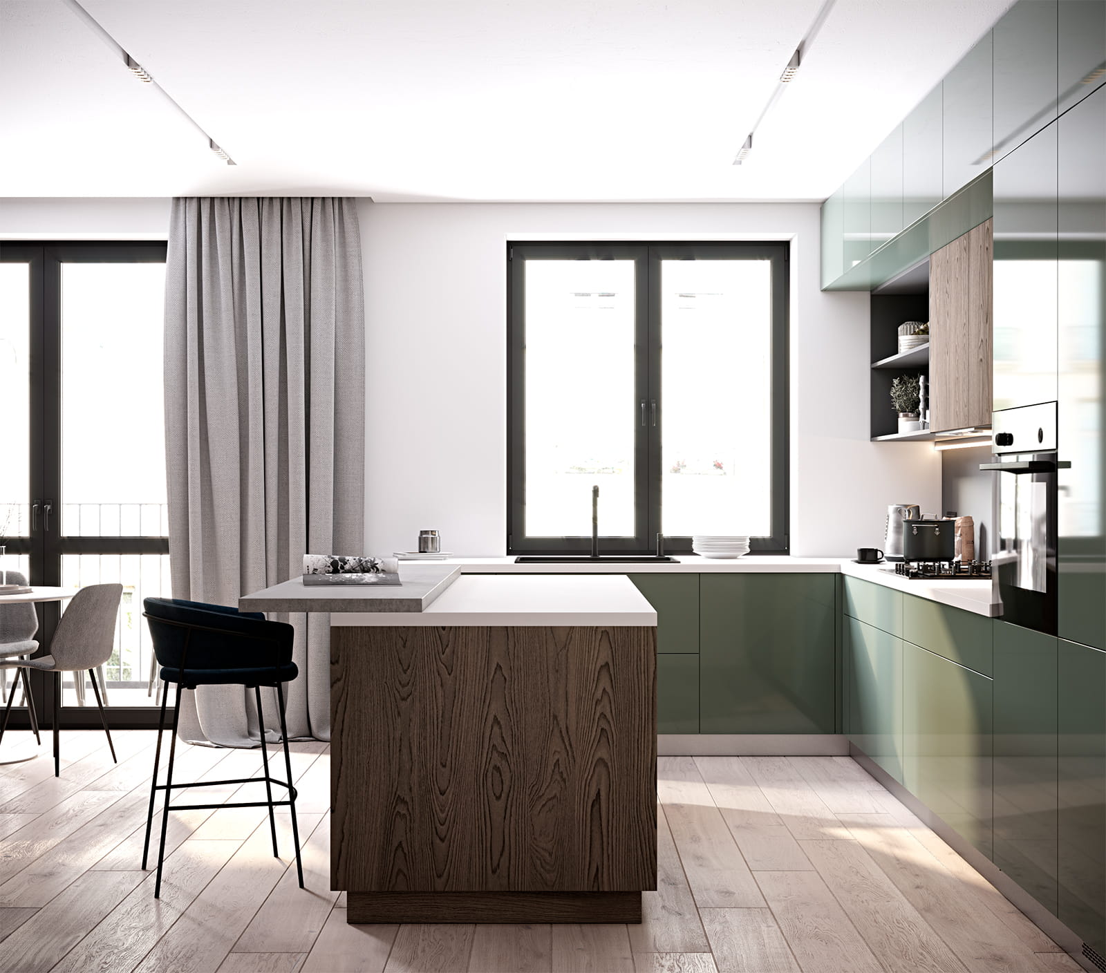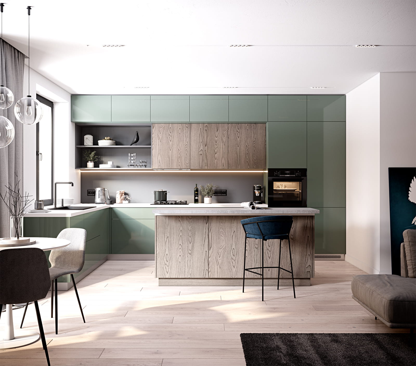 Фасады стекло, цвет аспарагус / лдсп смарт, цвет тундра столешница пластик hpl, 38 мм, цвет айси / хромикс серебро