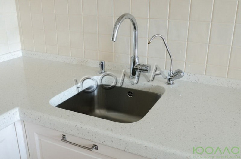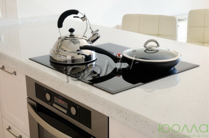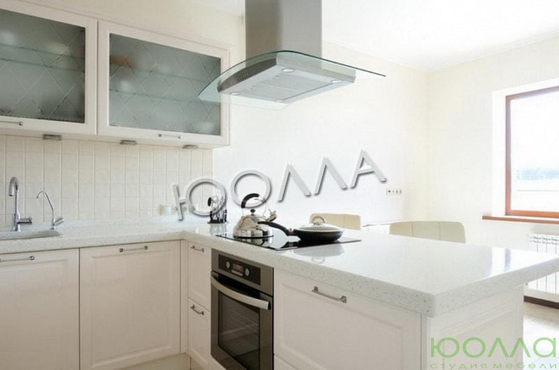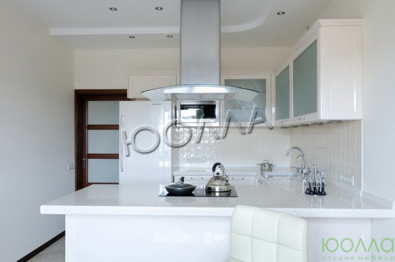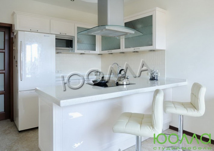 Кухонный гарнитур «Балета» выполнен в белом цвете. Конструкция комплектуется толстой столешницей с врезной мойкой и встроенной варочной поверхностью. Тыльная сторона выступающих тумб служит обеденным столом, достаточно всего лишь приставить кухонные стулья. Кухня изготовлена со скрытыми креплениями и фурнитурой по немецкой технологии "Фолдинг".