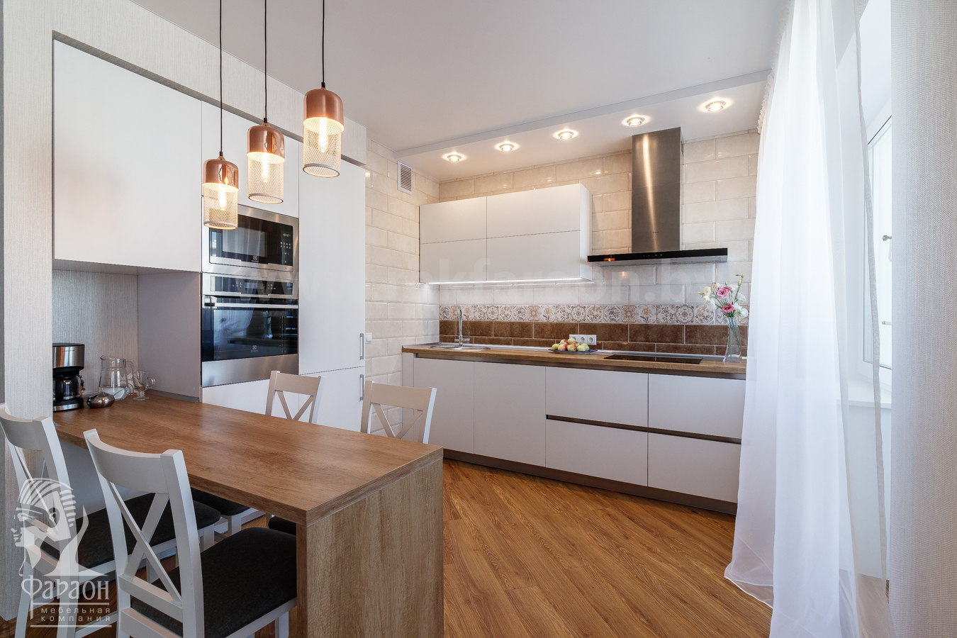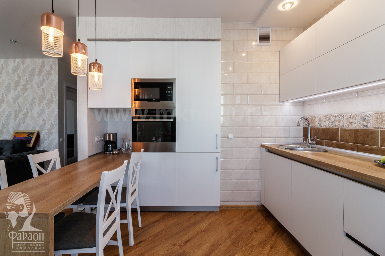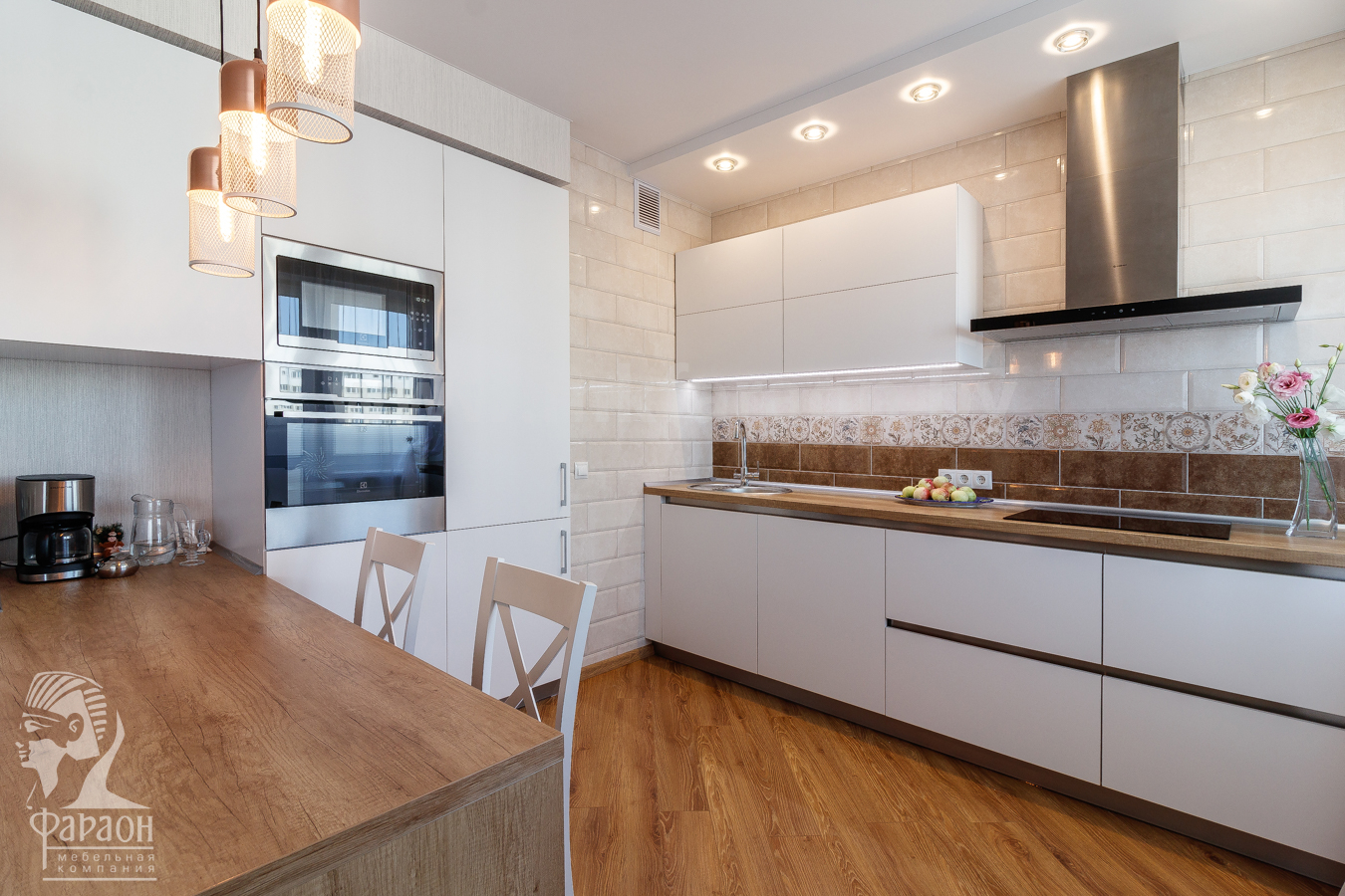 Темно-коричневая столешница и белый фасад. Ниша для духового шкафа.