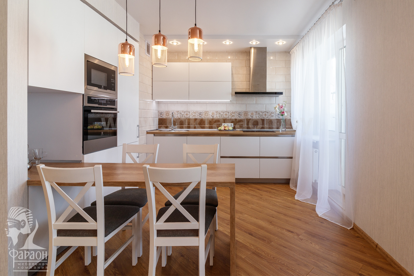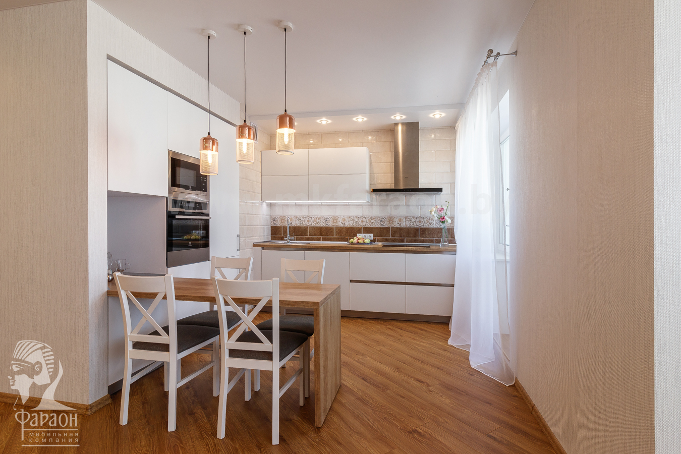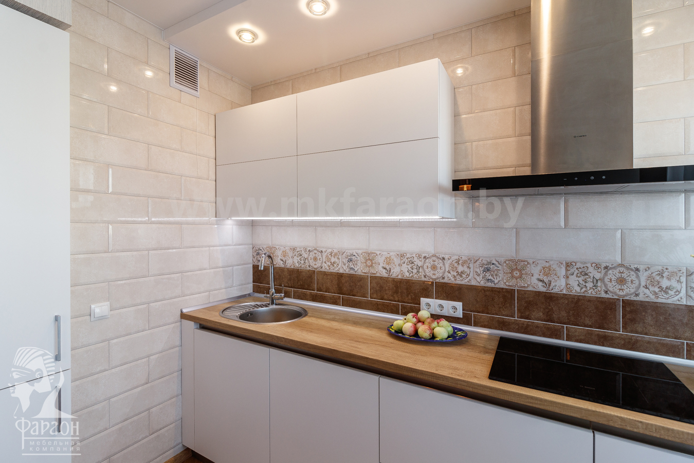 Темно-коричневая столешница и белый фасад. Ниша для духового шкафа.