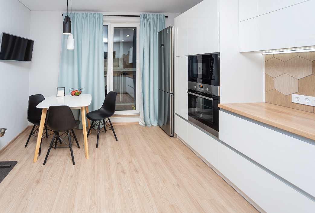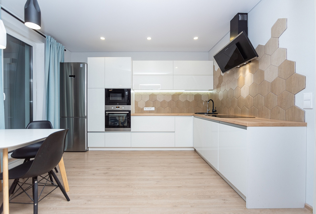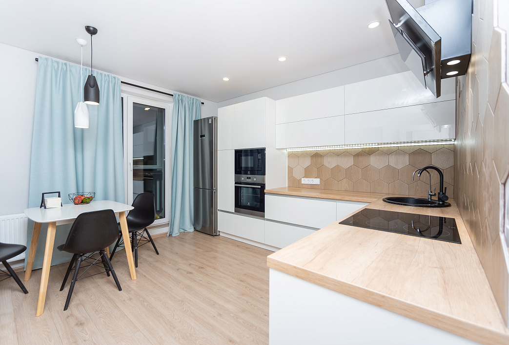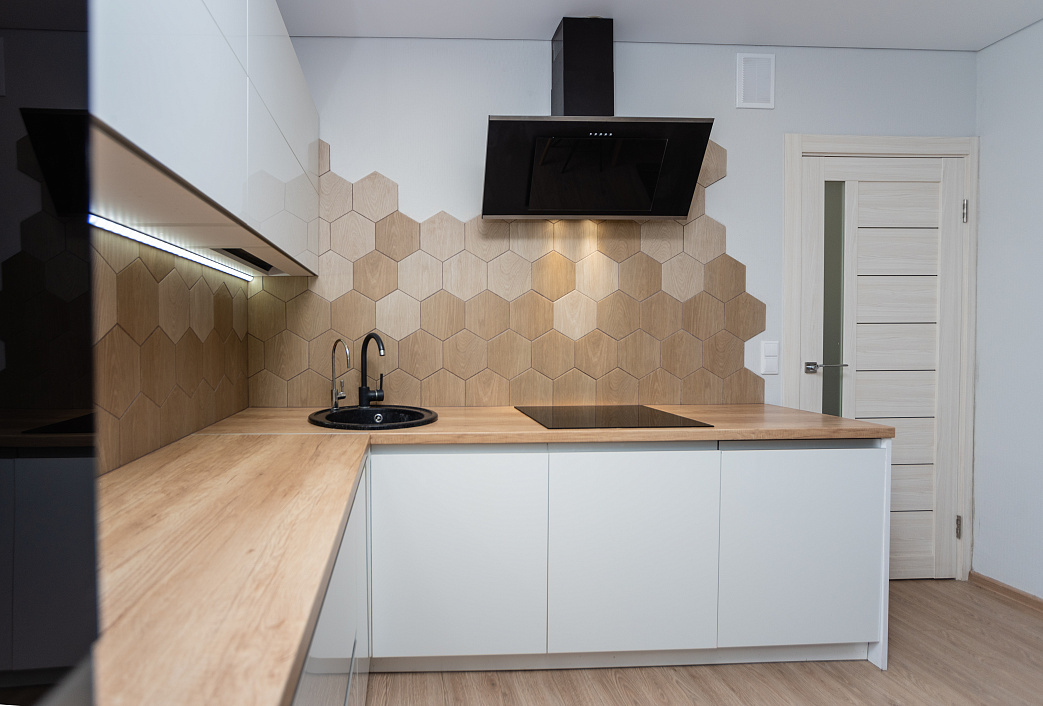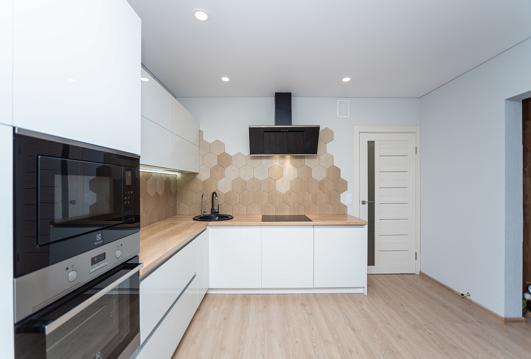 Белый тон фасадов в тандеме с древесным оттенком столешницы.