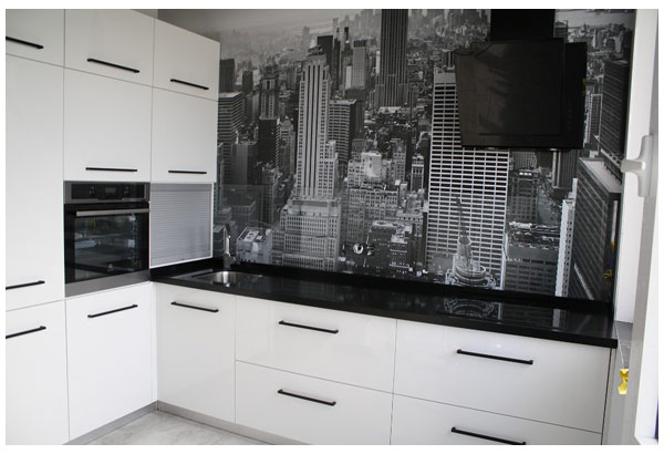 Ультрасовременная кухня, сочетающая контрастные оттенки: черная столешница и ручки шкафов и белый глянцевый фасад.
