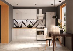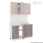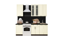Отличительной чертой гарнитура является двухрядный комплект верхних шкафов, который максимально оптимизирует свободное пространство. Встроенная конструкция кухни делает модель пригодной даже для самых маленьких кухонь.