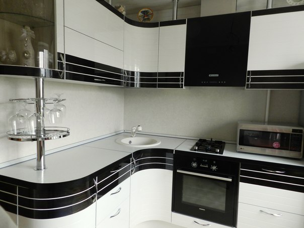 Данная кухня представлена в монохромном сочетании белого и черного цветов. Края гарнитура имеют легкое закругление. В конструкции также предусмотрена стойка с подставкой для бокалов. Фасад имеет глянцевый отблеск.